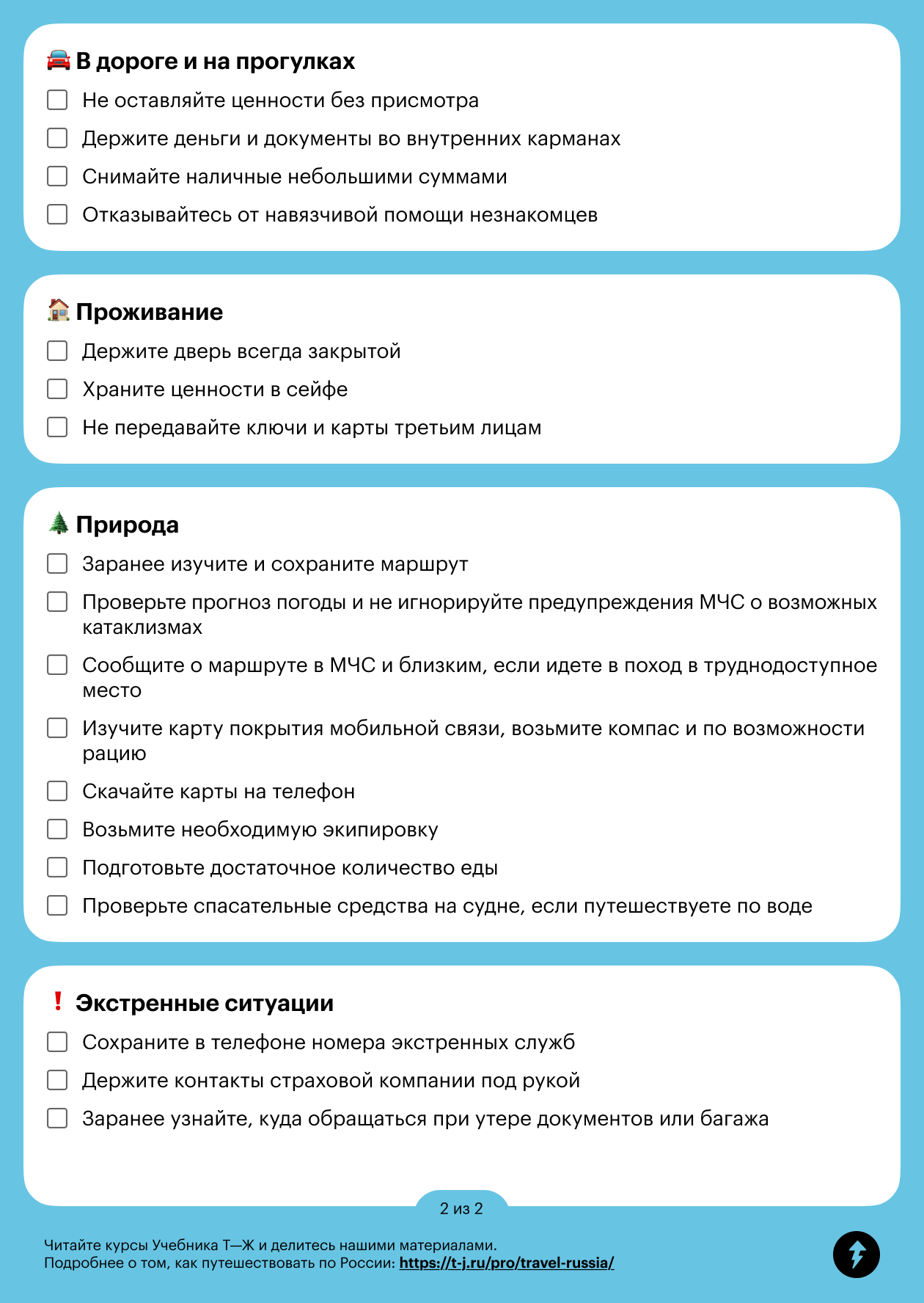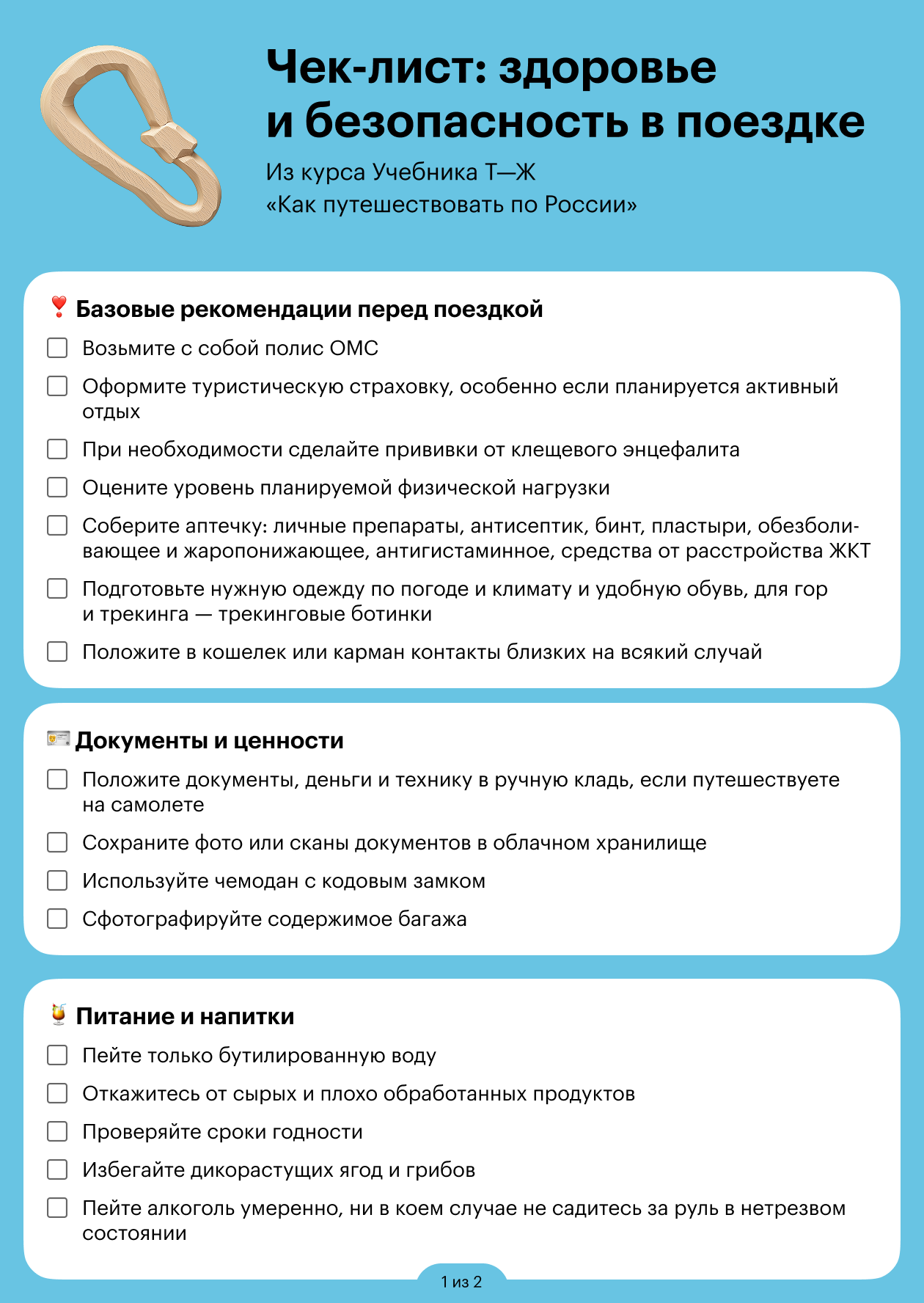 Урок почти закончен. Напоследок собрали для вас чек-лист с полезными советами из урока. Скачайте его в формате PDF или отправьте себе в телеграм-сообщении, чтобы в поездке он был у вас под рукой.