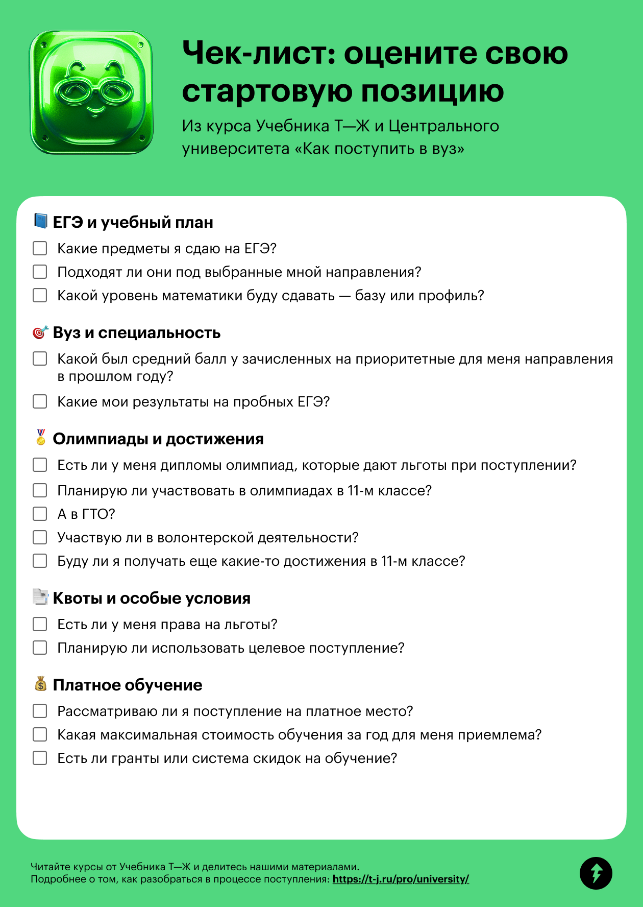 Звучит серьезно, но на деле все просто. Стартовая позиция — это все, что у вас уже есть: какие ЕГЭ вы выбрали, есть ли у вас достижения, подойдете ли вы под квоту. Чем лучше вы это понимаете сейчас, тем проще выбрать реалистичную стратегию и повысить свои шансы.