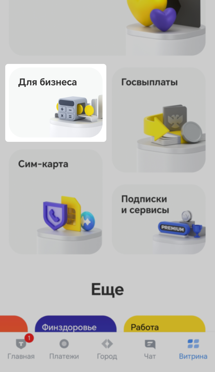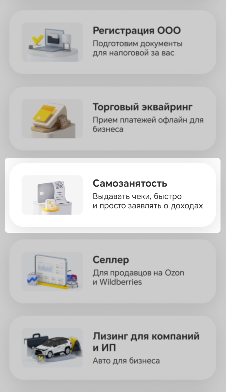 Чтобы зарегистрироваться самозанятым в мобильном приложении, откройте «Главная» → «Витрина» → «Для бизнеса» → «Самозанятость» → кнопка «Оформить самозанятость».