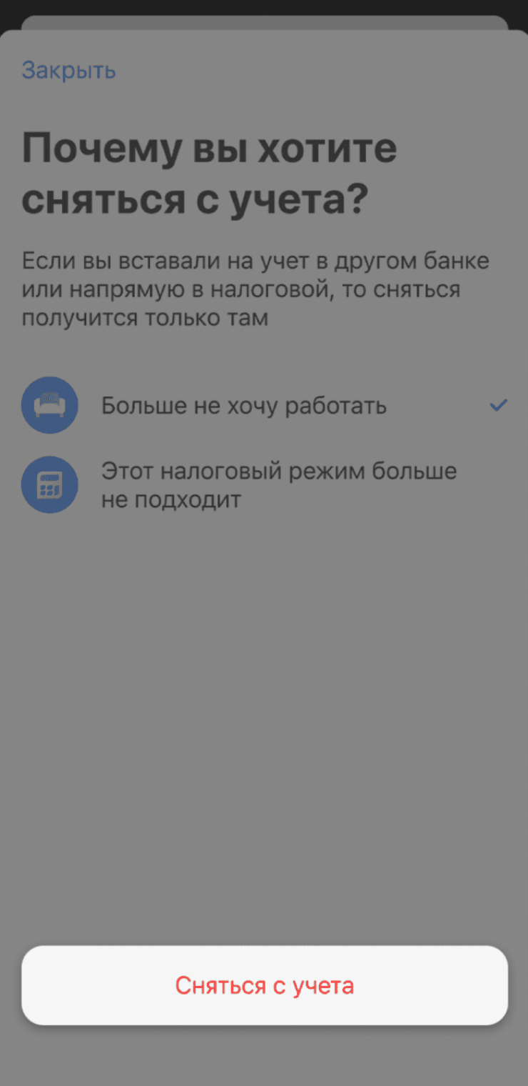 Все это тоже делается удаленно — в приложении или личном кабинете вы заходите в настройки и выбираете пункт «Сняться с учета». Выбираете причину и подтверждаете.