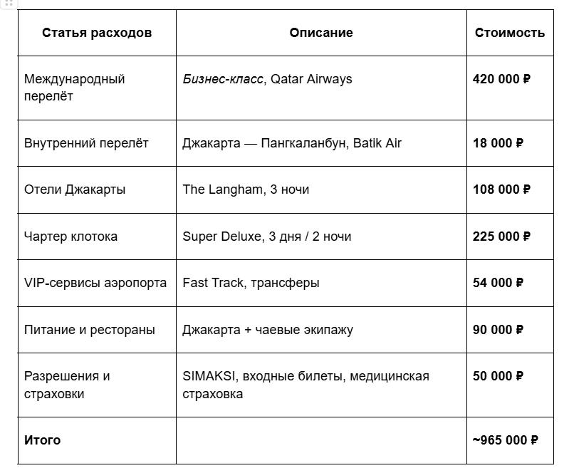 Вот честная смета нашего путешествия в Индонезию на 10 дней (3 дня Джакарта + 4 дня экспедиция + 3 дня резерв/транзит), на одного человека: