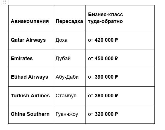 - Бизнес-класс туда-обратно — от 380 000 ₽.