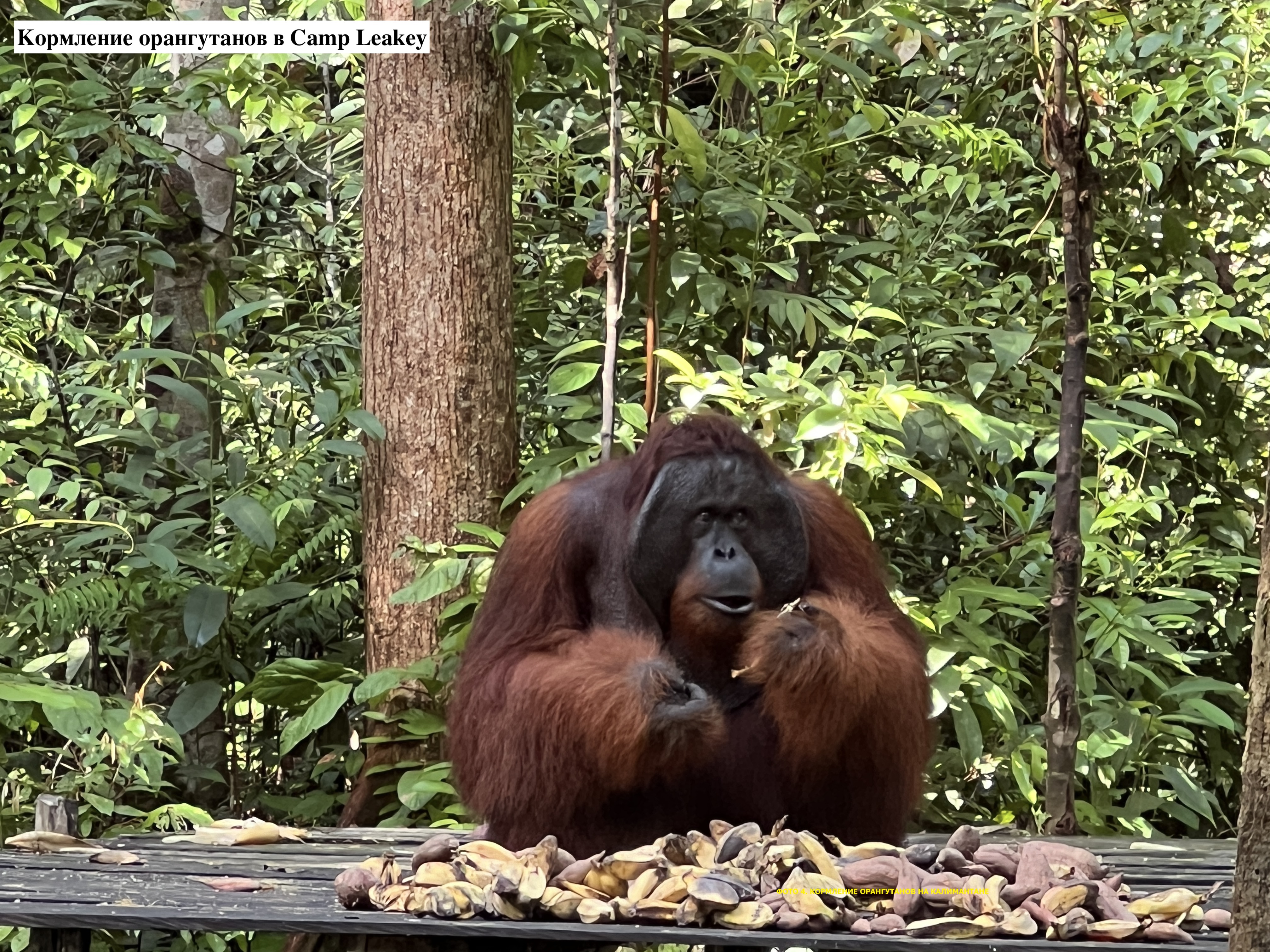 Кормление в 14:00. На дорогу, ведущую к подкормочной платформе, спустился здоровенный самец орангутана и, пройдя в метре от нас, отправился к куче бананов, которые рейнждер уже высыпал на платформу. Я испытал смешанные чувства, хотя и знал что орангутаны не нападают на людей.