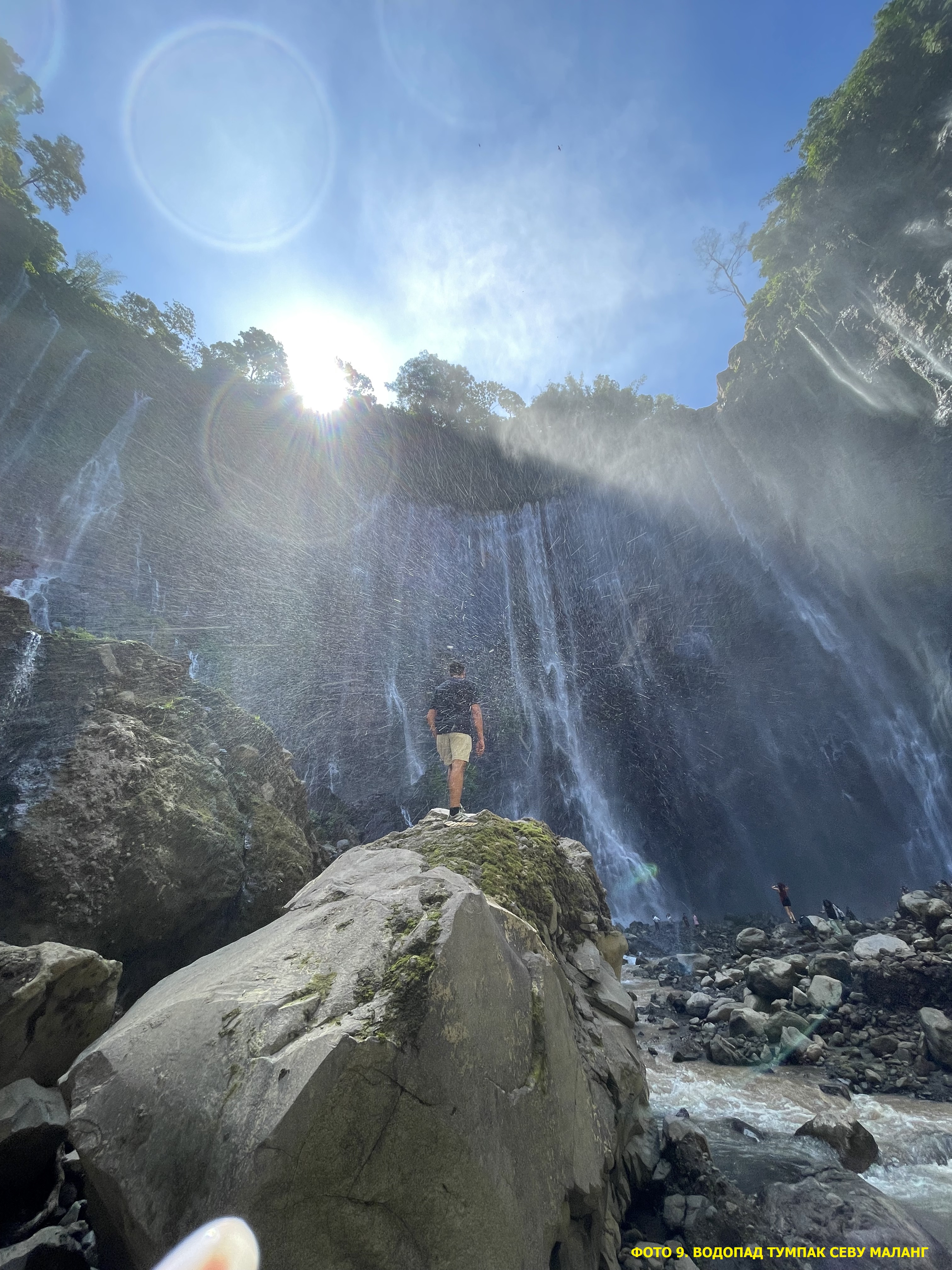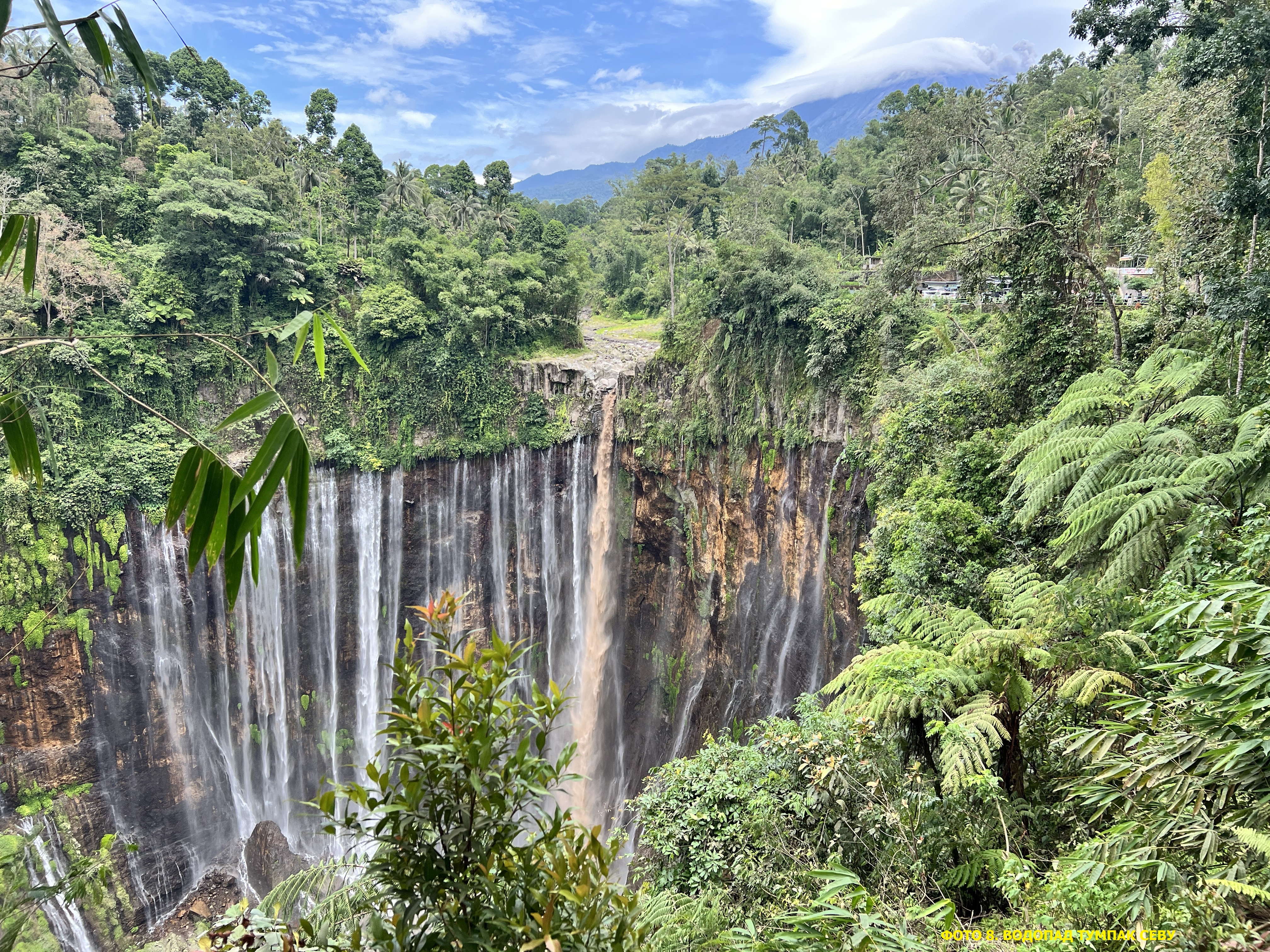 Tumpak Sewu переводится с яванского как «тысяча струй». Когда стоишь на панорамной площадке и смотришь вниз — понимаешь почему. Это не один поток, а гигантский полукруглый амфитеатр из сотен струй, которые обрушиваются с высоты 120 метров в глубокий каньон. На заднем плане — дымящийся конус вулкана Семеру, самой высокой точки Явы. До панорамной площадки — десять минут пешком от парковки. Это лёгкая часть. Дальше начинается приключение.