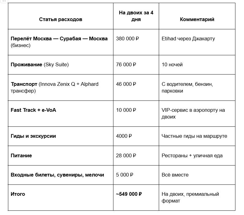 Я начал считать. Перелёт из Москвы в Сурабаю через Джакарту — от 65 000 ₽ в экономе, от 170 000 ₽ в бизнесе на одного. Виза по прилёту — 3 150 ₽. Неделя на маршруте с хорошим отелем, машиной и гидом — ещё 200 000–300 000 ₽ на двоих. Итого: реально уложиться в 400 000 ₽ на двоих в комфортном, но не безумном формате.