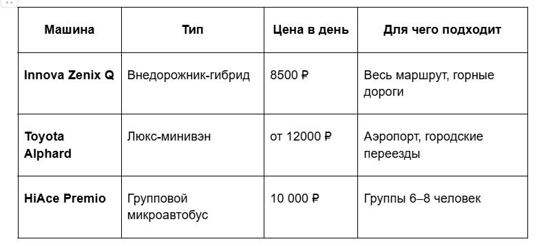 Я выбрал Toyota Innova Zenix Q — гибридный внедорожник с высоким клиренсом, кондиционером и нормальными сиденьями. Аренда с водителем — 34 000 ₽ за 4 дня, или примерно 8500 ₽ в день. В эту сумму входит бензин, платные дороги и парковки.