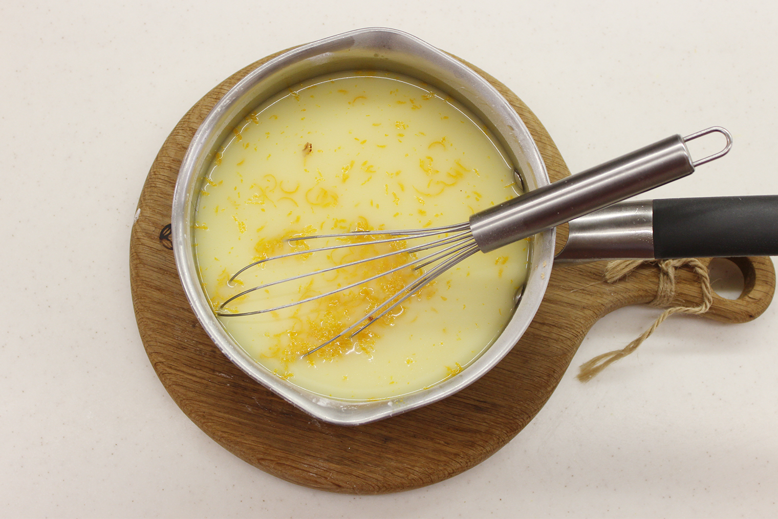 Шаг 3. Воду с соком соедините в сотейнике. Апельсиновую цедру натрите на мелкой терке и добавьте в жидкость, всыпьте сахарно-крахмальную смесь. Перемешайте венчиком до однородности и доведите до кипения.