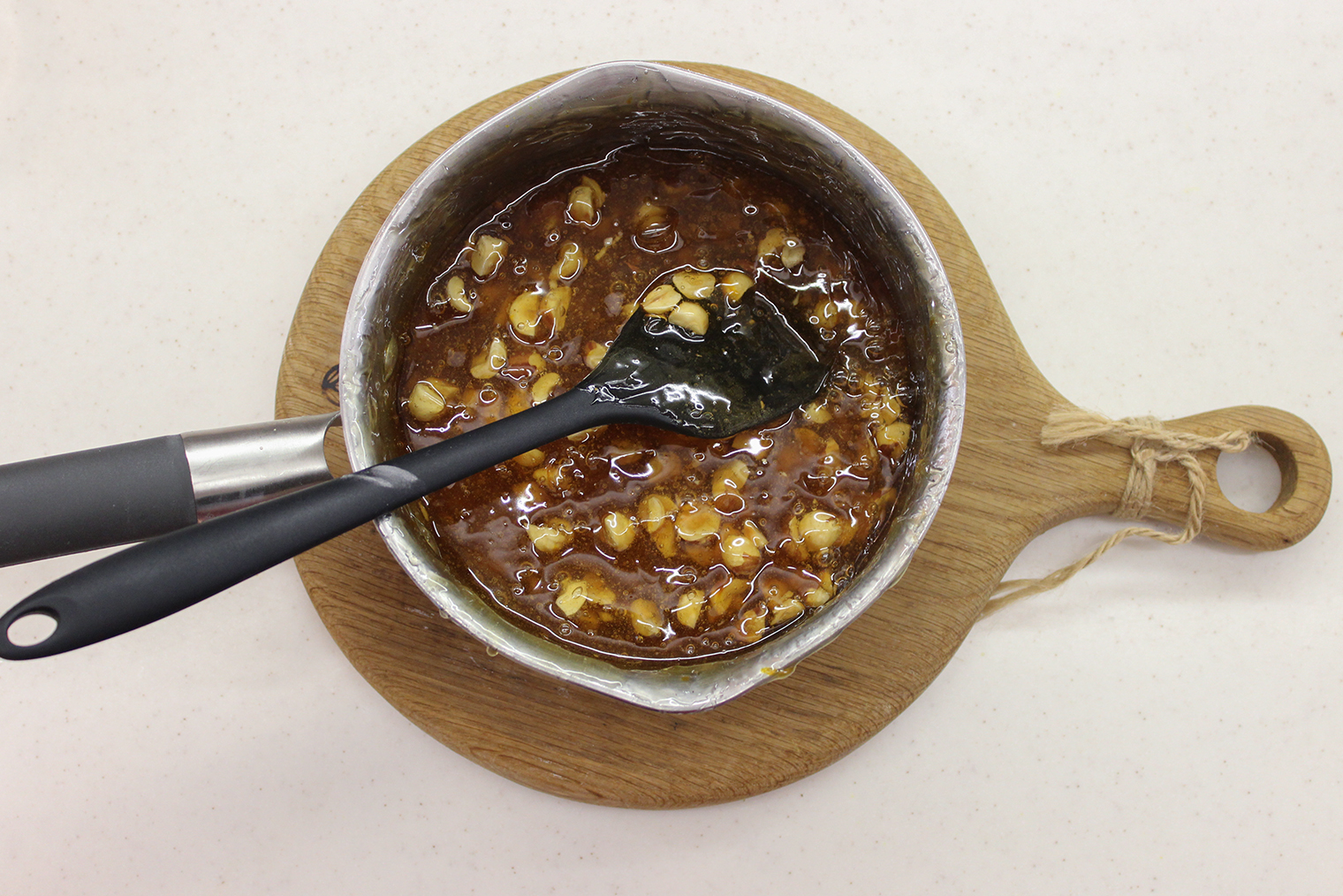Шаг 6. Рубленый фундук всыпьте в горячую сахарно-крахмальную массу, перемешайте.