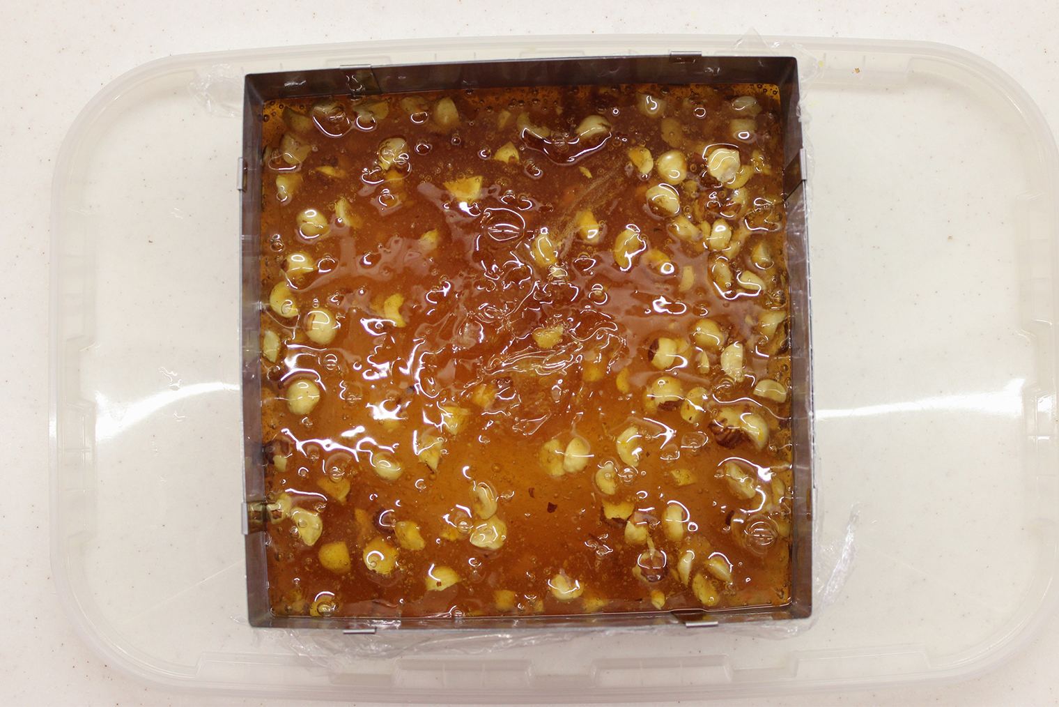 Шаг 1. Форму для выпечки обтяните пищевой пленкой так, чтобы получилось дно. Установите на плоскую поверхность — деревянную доску или термоустойчивый пластик. Так лукум будет удобно стабилизировать и переносить.
