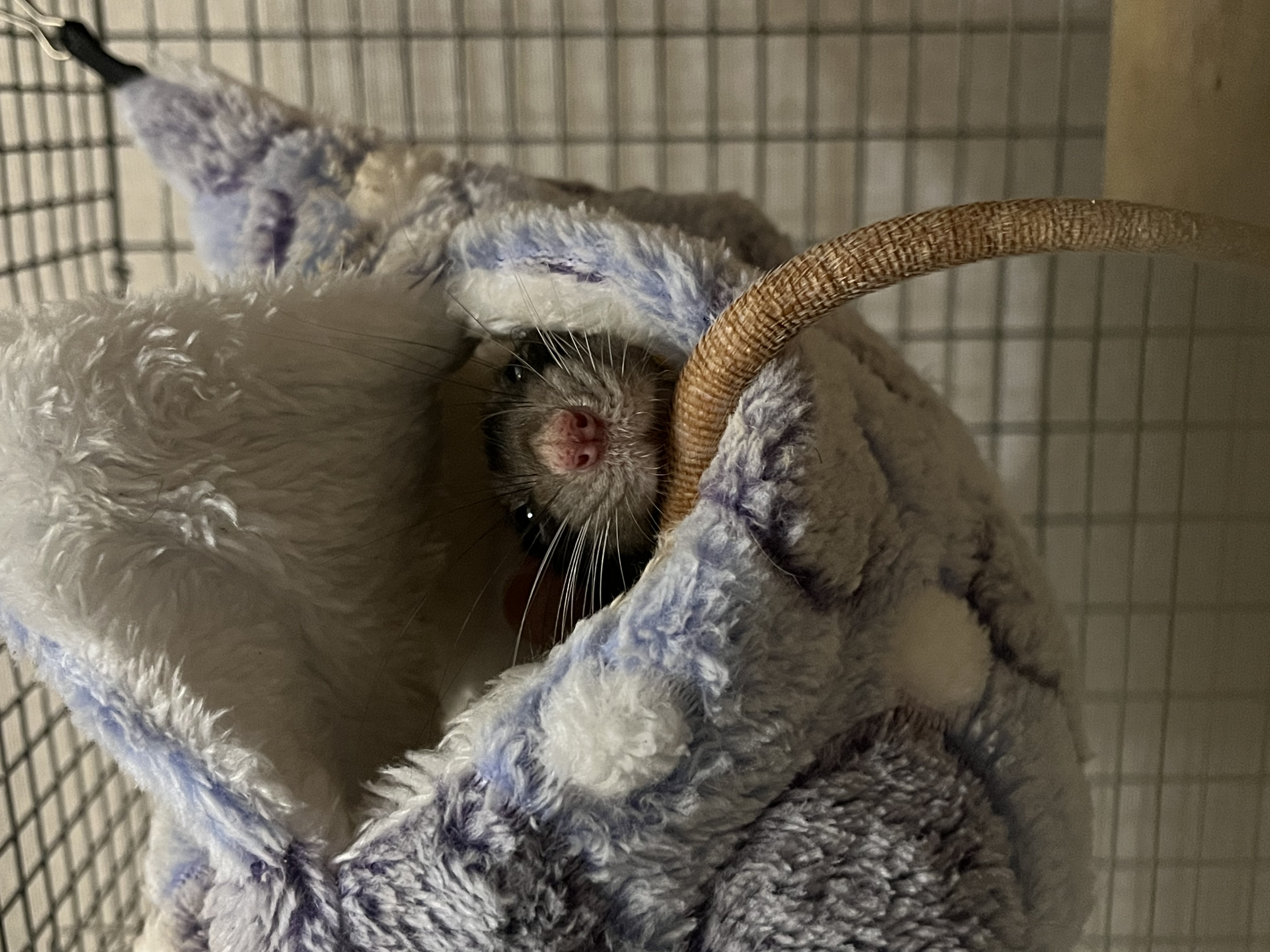 Фото питомца: крыса Чернуха сонно выглядывает из гамака