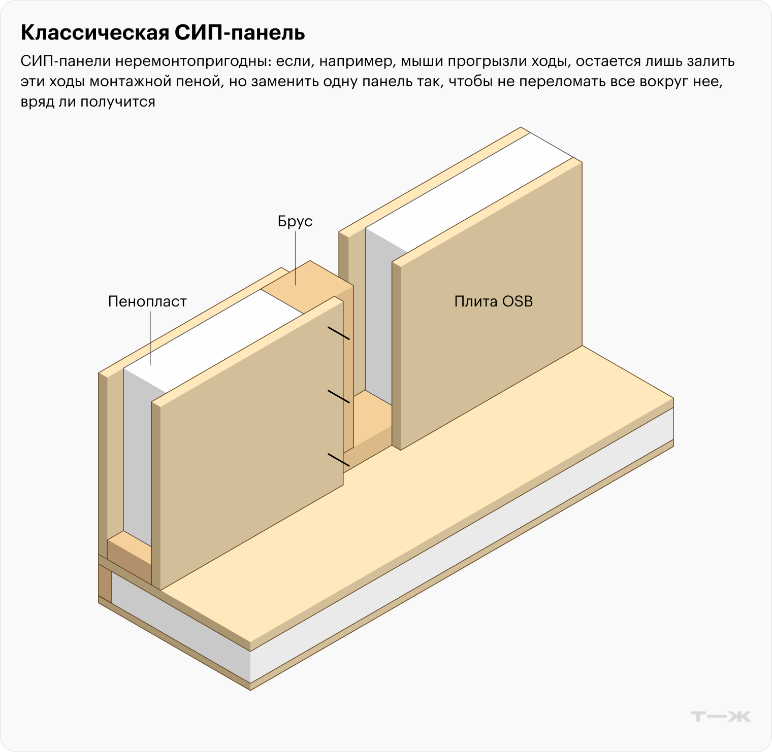 Но расчет на калькуляторе — это лабораторная модель. В реальной жизни тепло такой дом будет держать, только пока он новый. Между листами и панелями есть стыки, а в них могут появиться щели и бреши, это неизбежный процесс. Щели могут возникнуть сразу из-за некачественного монтажа или позже — из-за мышей или подвижек фундамента. Вопрос времени.
