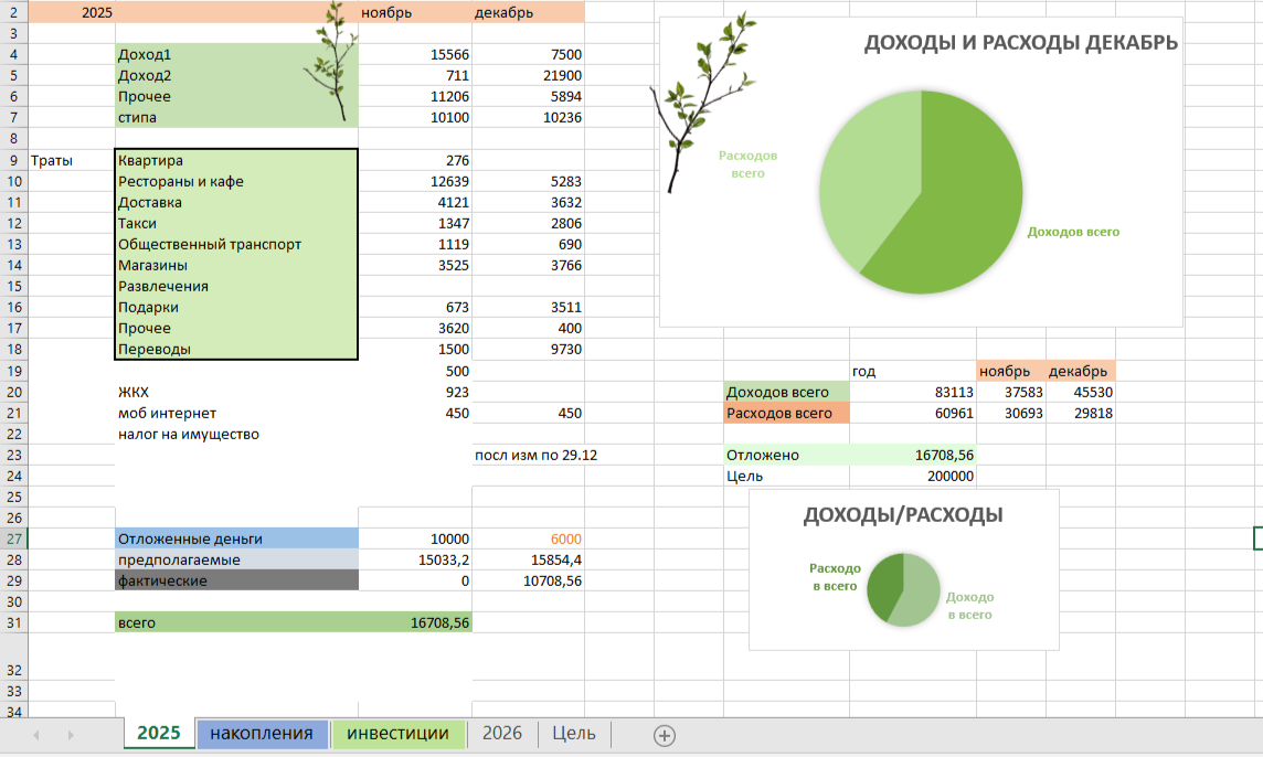 Доходы и траты веду в табличке. Скачивала кучу разных шаблонов для ведения личного бюджета, но ни один из них не подходил под мои желания. Решила, что сделаю сама, мне так проще и удобней. Начала вести в ноябре 2025. Есть несколько листов: 2025 год; 2026; накопления, где я веду учёт отложенных средств; инвестиции.