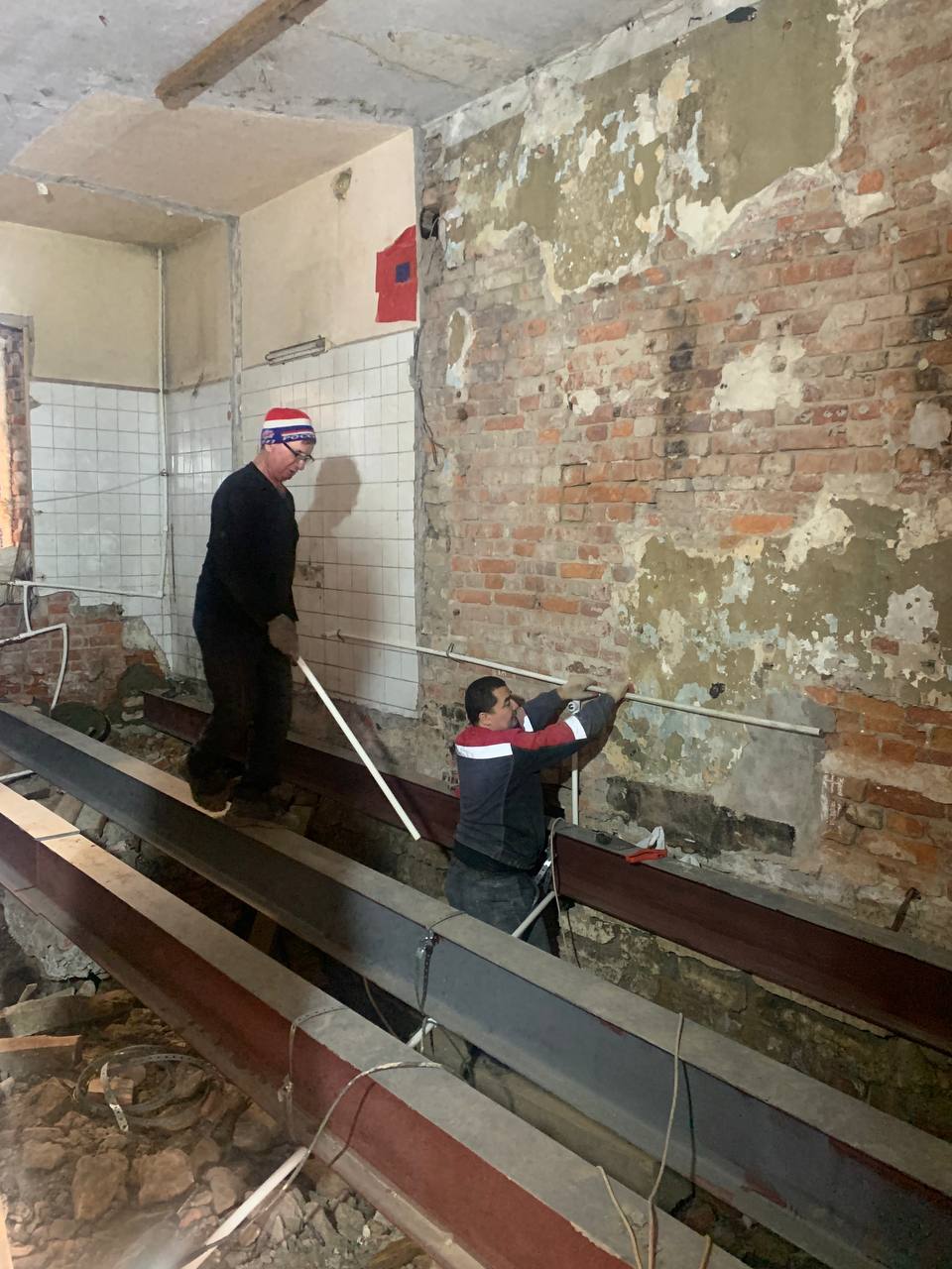 Не забываем подвал помещения сенсорной интеграции: там демонтировали старые трубы, проложили новые, углубили ниши под батареи. Кирпичи снова сложены, армирование и штукатурка проведены, стены загрунтованы. На трубах установили перемычки и вентили, чтобы в будущем не бегать с гаечным ключом в случае чего. Общий бюджет — 250 тыс. рублей.