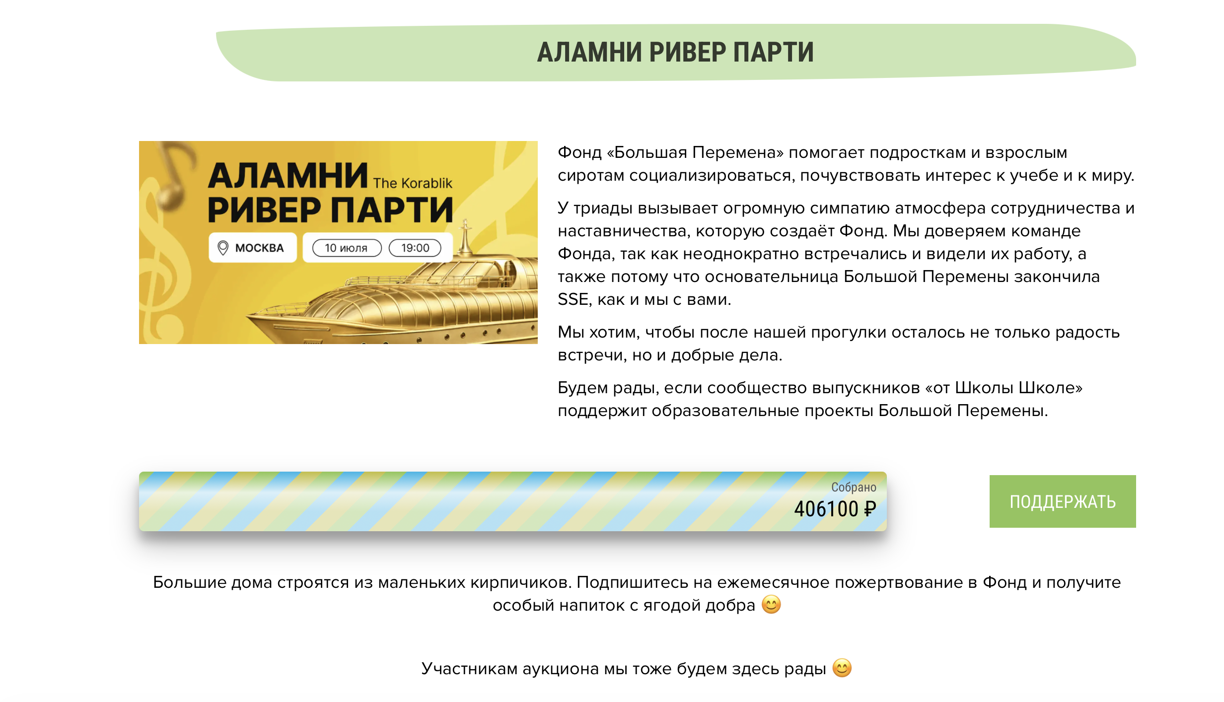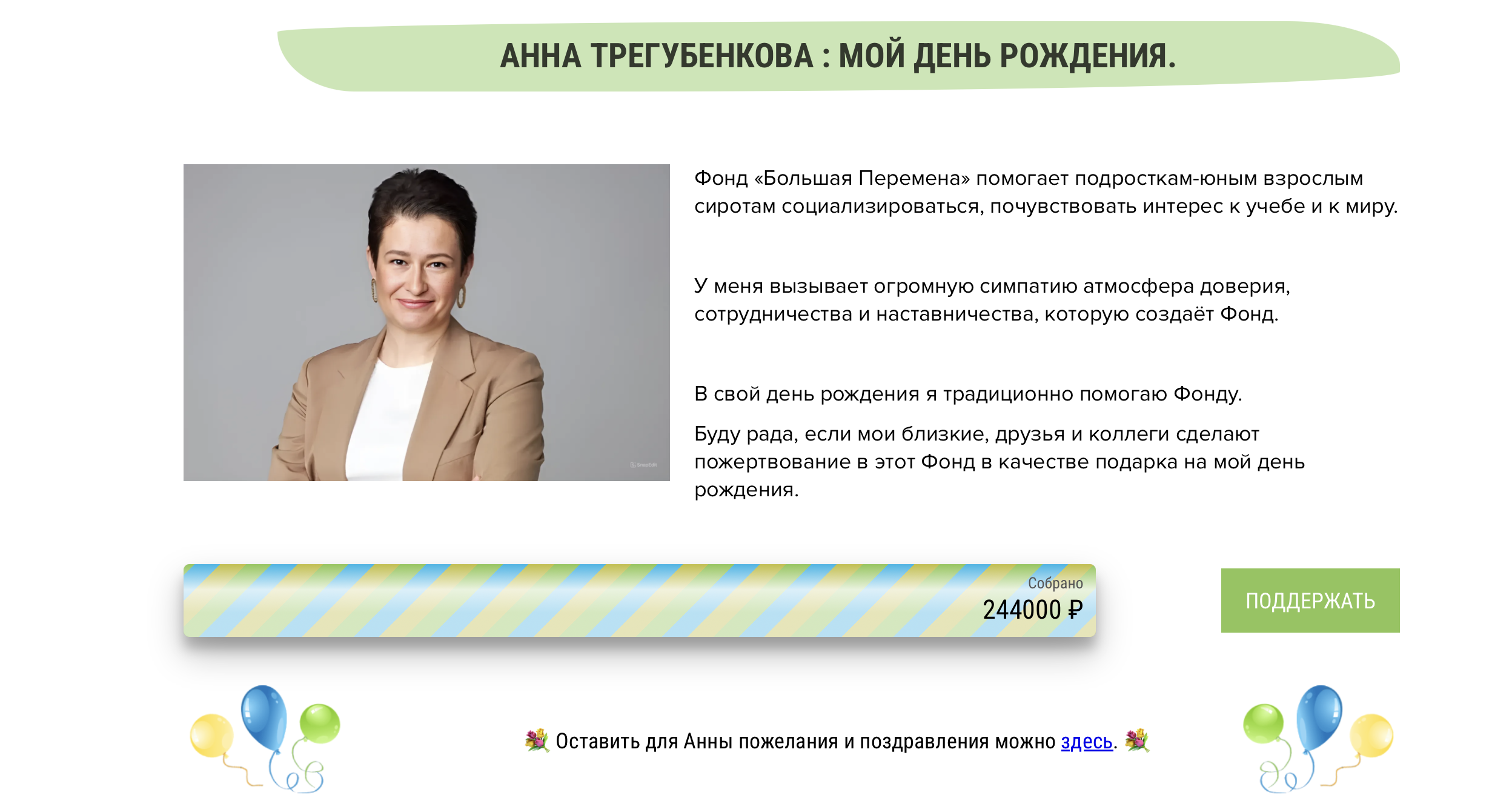 Для таких активных и ценностных людей мы создали платформу «Друзья перемен». Это раздел для друзей и волонтёров фонда, где каждый может запустить сбор в пользу «Большой Перемены» — независимо от масштаба идеи и доступных ресурсов. Мы верим, что именно из таких личных инициатив рождаются самые устойчивые и живые формы поддержки.