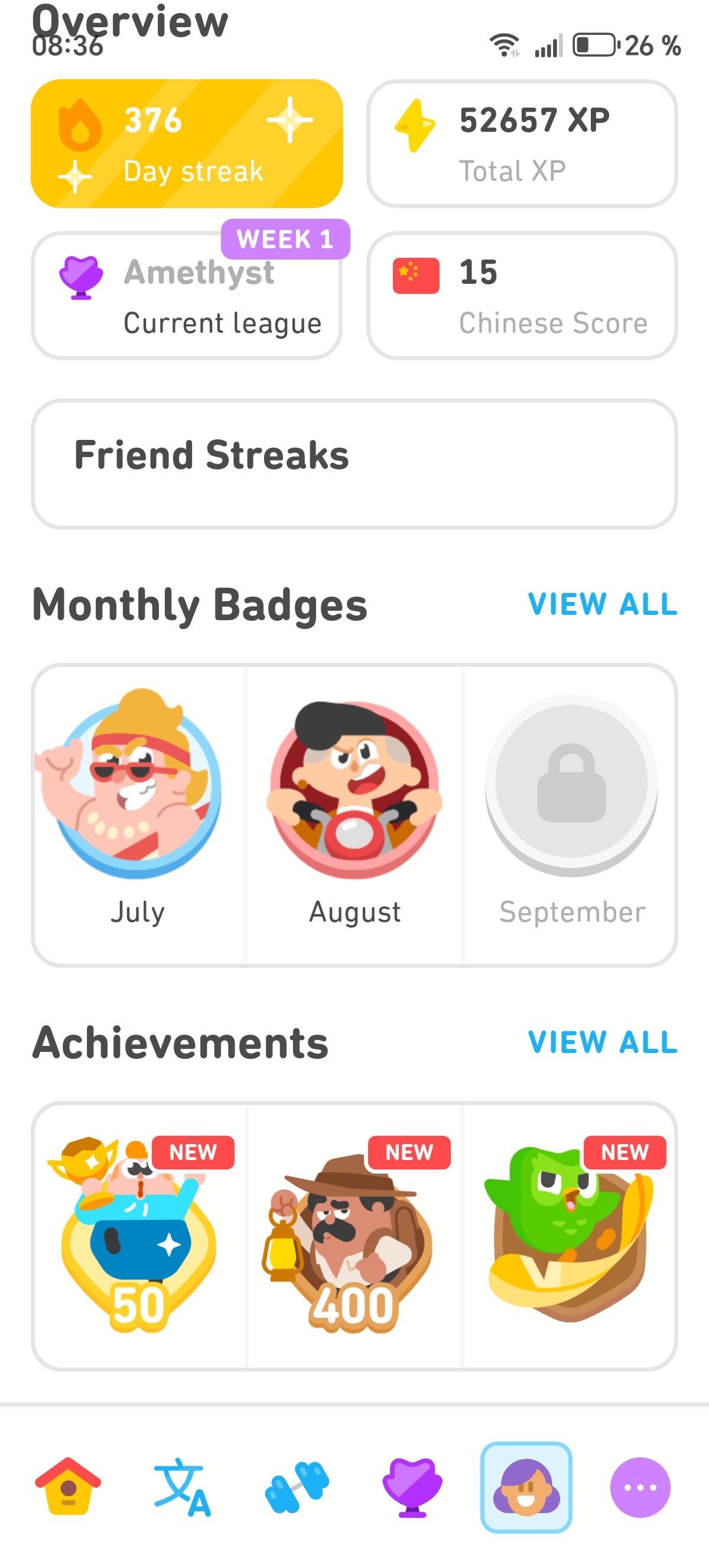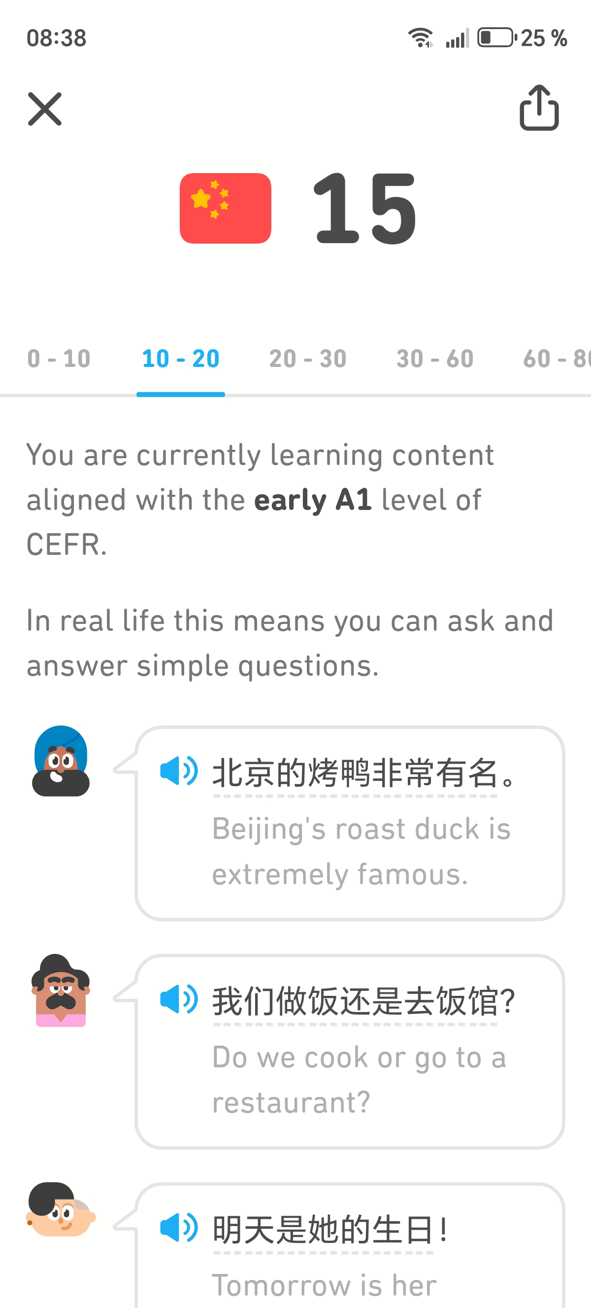 Моё изучение китайского началось с установки Duolingo и год спустя приложение определяет мой уровень как нижнюю границу A1 по CEFR.