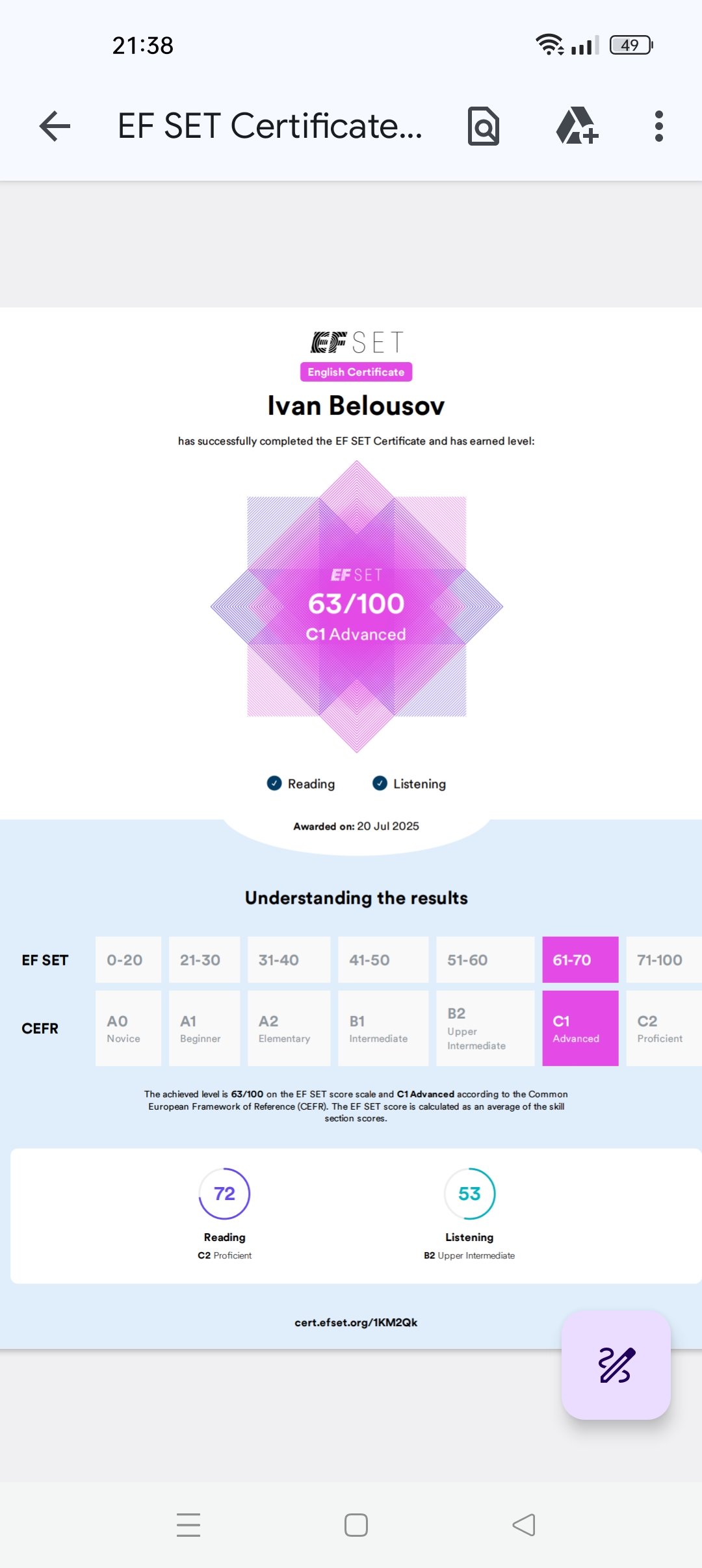 Пока я доволен своим прогрессом. Можно было бы и лучше конечно, если бы не лень-матушка, и дела. Время от времени прохожу различные тесты на определение уровня. Одним из открытых и бесплатных тестов — 50 минутный тест от Efset показал уровень C1. Но справедливости ради, там оценивается только чтение и аудирование. Другие тесты дают результат от B1 до C1.