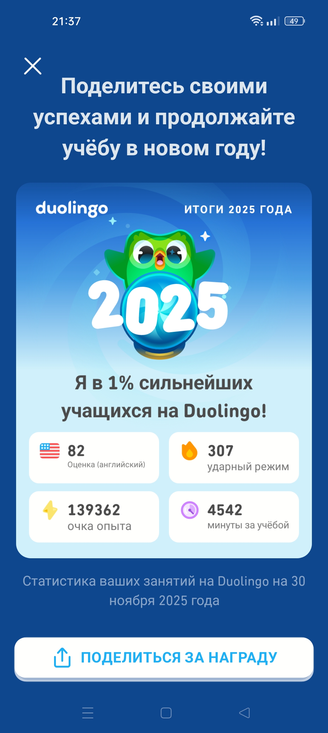 Параллельно занимаюсь в Дуолинго. Сейчас моя серия составляет там 330 дней. Сова мной довольна. Это приложение можно использовать как один из инструментов, но только с его помощью выучить язык невозможно. Оно хорошо подходит для отработки до автоматизма уже имеющихся знаний, нежели для изучения нового. Также использую сайты Лингвалео и ПазлИнглиш, там много классных упражнений на улучшение словарного запаса. Непонятные слова я добавляю в приложение Reword, суть его в том, что слова даются там с интервальным повторением, что улучшает запоминаемость. Там есть встроенный словарь, но можно добавлять слова и самостоятельно. За год выучил около 800 слов.
