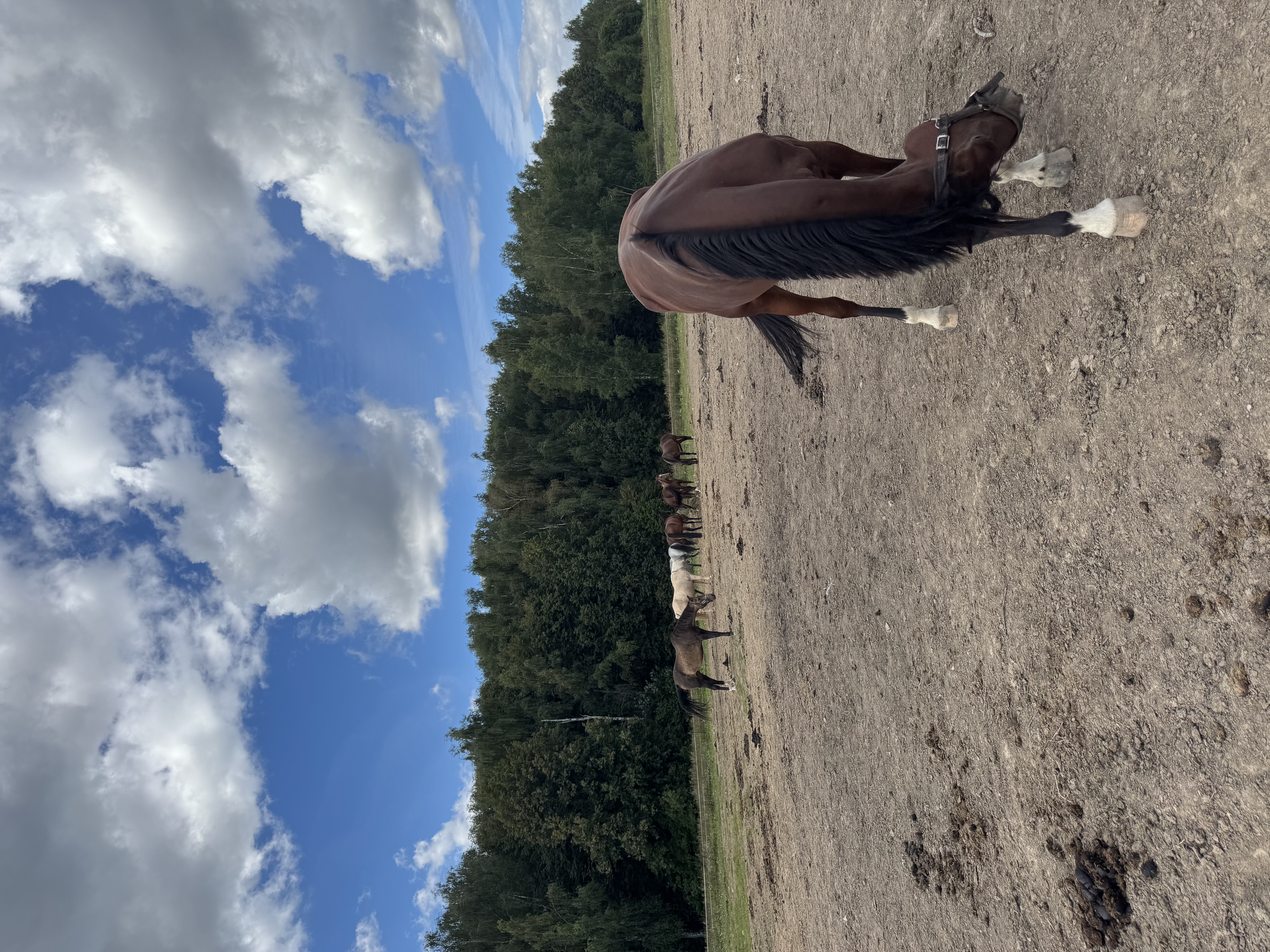 Лошадь зовут Грета. Ей 5 лет. К сожалению, ей никто не занимался и что такое всадник она не знает.