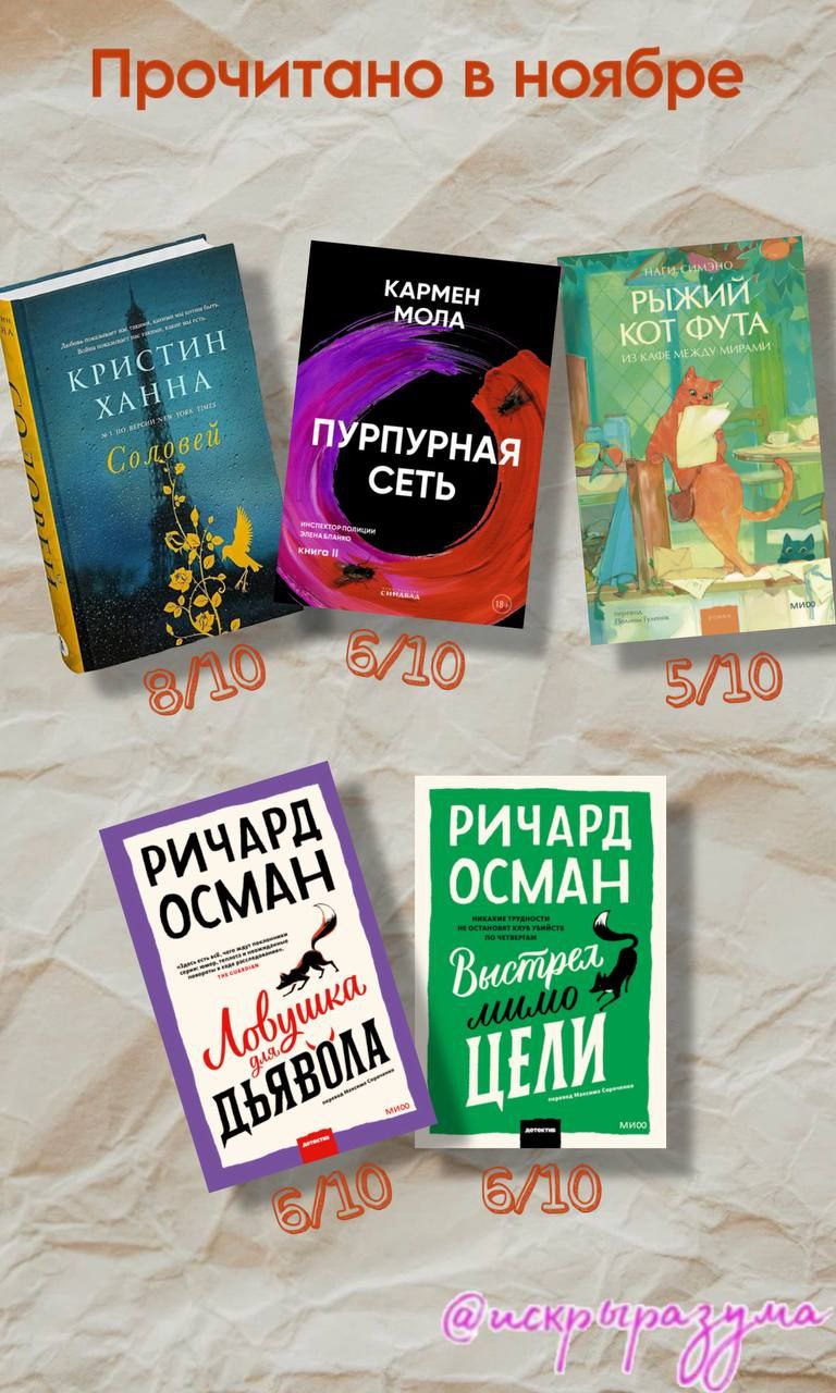 Дочитала с октября вторую часть триллера Кармен Молы "Пурпурная сеть" — 6\10, проглотила третью и четвертую части Клуба убийств по четвергам (по 6\10). Еще был "Рыжий кот Фута из кафе между мирами" — филгуд роман Наги Симэно. Приятная, но неглубокая книга — 5\10.