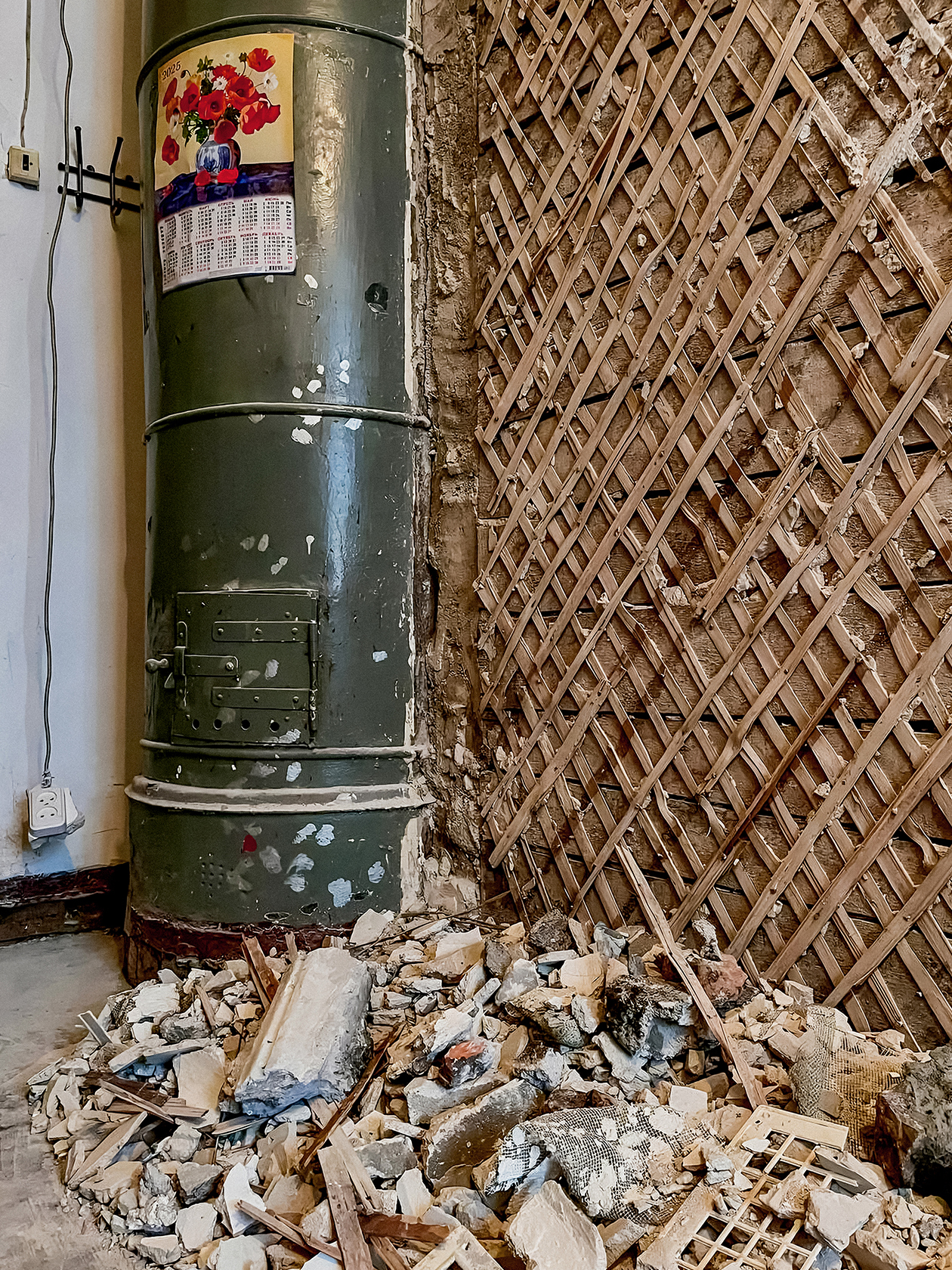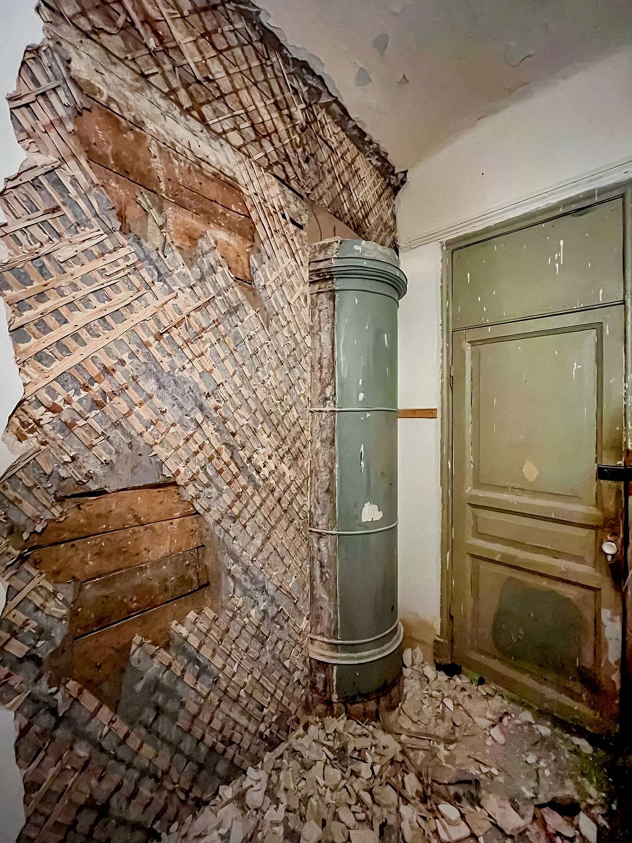 Печь хотим сохранить. Дима ее освободил от перегородок, чтобы она полноценно размещалась в одном помещении. Это было его давнее желание, так как, скорее всего, печь рабочая. Мы бы хотели ее топить, но нужно получить разрешение на это. И пока мы не уверены, что на втором этаже можно топить, — кто как говорит.