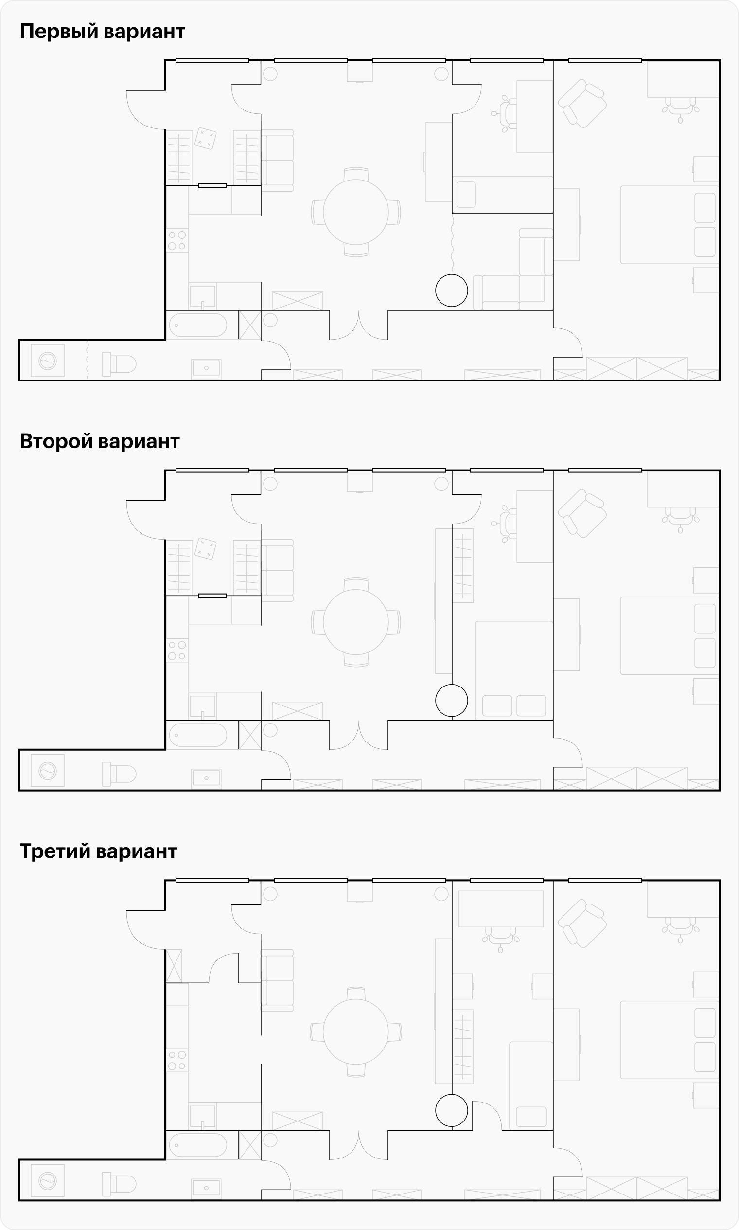 Учитывая наши нужды, мы нарисовали несколько вариантов перепланировки.