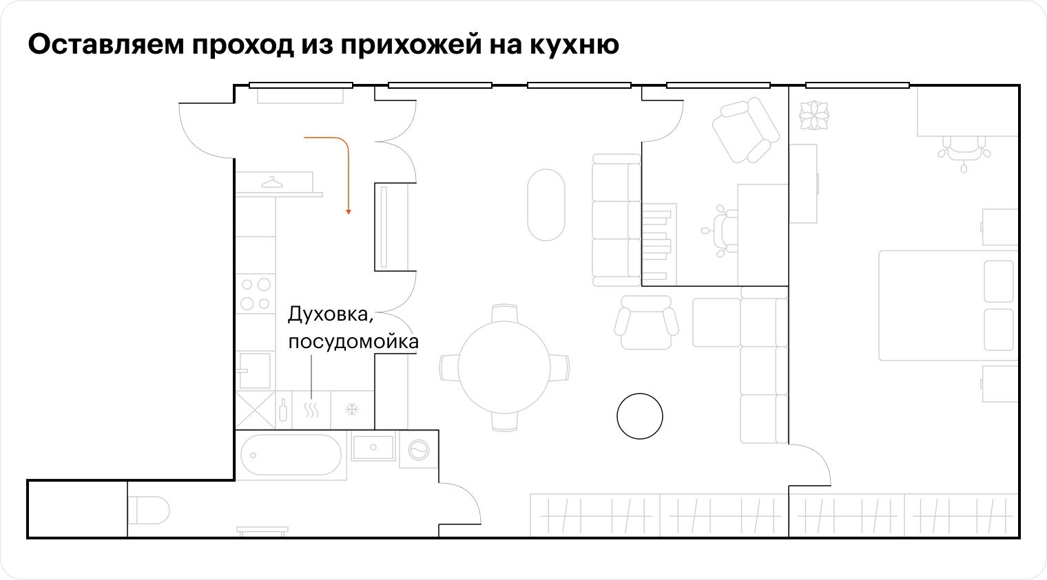 Гостиная. Убираем коридор — он только мешается, в такое узкое пространство не встанет ни один внятный шкаф. Исходная ширина коридора — 1,5 м, из них 60 см займет шкаф, останется едва 90 см — недостаточно для полноценного прохода.