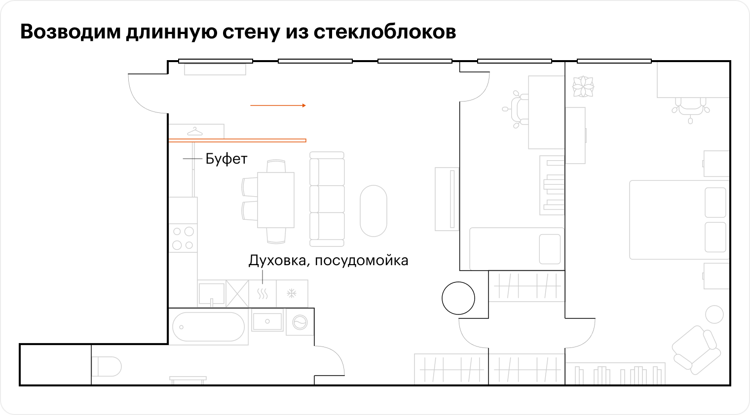 Прихожая. Стену со стеклоблоками продлеваем до границ гостиной. Можно будет поставить вдоль этой стены невысокие шкафы, но надо смотреть, сколько останется света.
