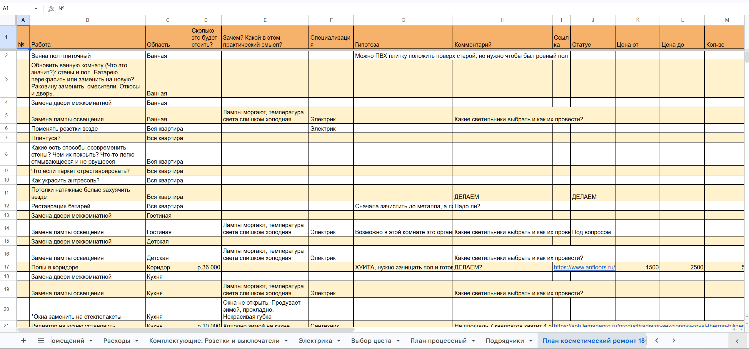 Я так для себя сейчас понял: чтобы захотеть сделать ремонт, нужно быть чем-то недовольным. А чтобы довести ремонт до конца и не сдаться в многочисленных сложностях, нужно себе про эти "недовольства" постоянно напоминать. Выбираю для этой цели эксель вместо блокнота, чтобы иметь возможность проранжировать поводы для недовольства относительно друг друга.