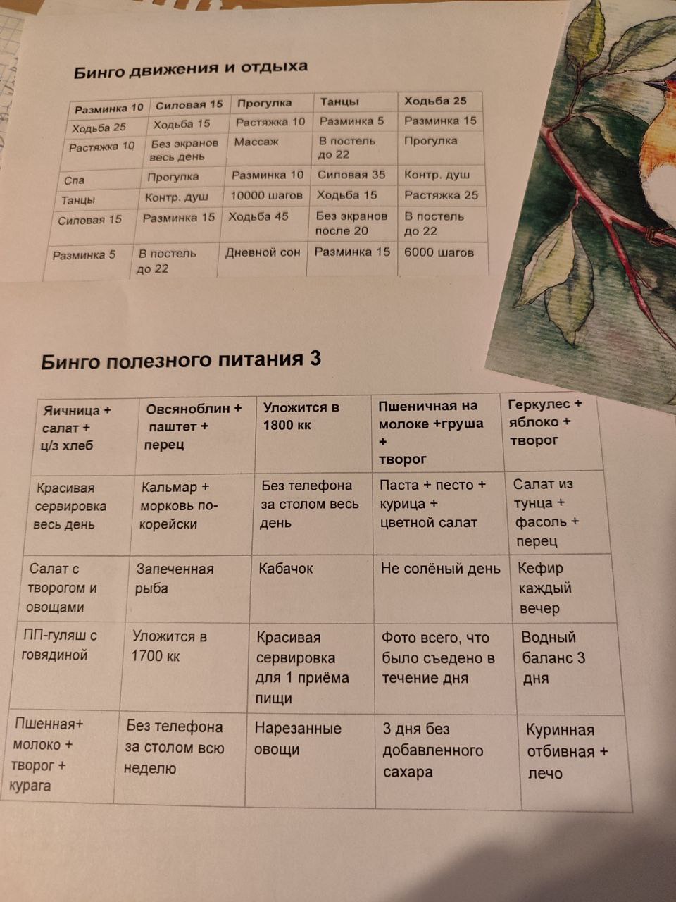 Для того, чтобы легче было делать своё питание разнообразным, но при этом не писать «Меню на неделю» (никогда не получалось придерживаться плана), я придумала для себя игру «Бинго полезного питания». Просто пишу в ячейках идеи приёмов пищи/полезных действий разной сложности и стремлюсь за неделю собрать хотя бы одно бинго. Никакой обязаловки, но идеи перед глазами. Что планирую «закрасить» на следующий день, планирую накануне.