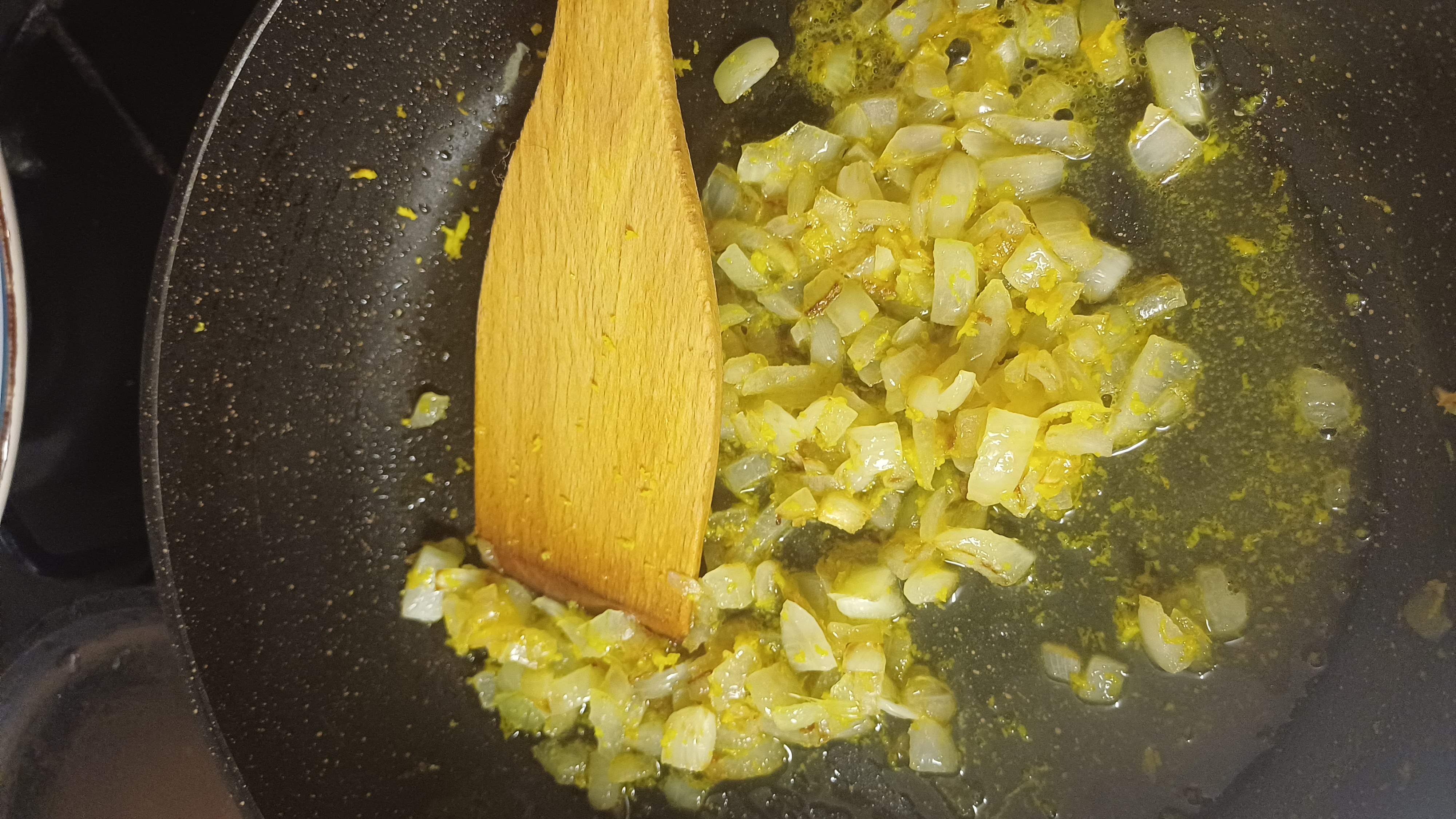 - Лук режу как угодно — крупно, мелко, хаотично. Потом блендер всё уравняет. Обжариваю на сковороде с маслом до тех пор, пока он не станет волшебного золотистого оттенка.