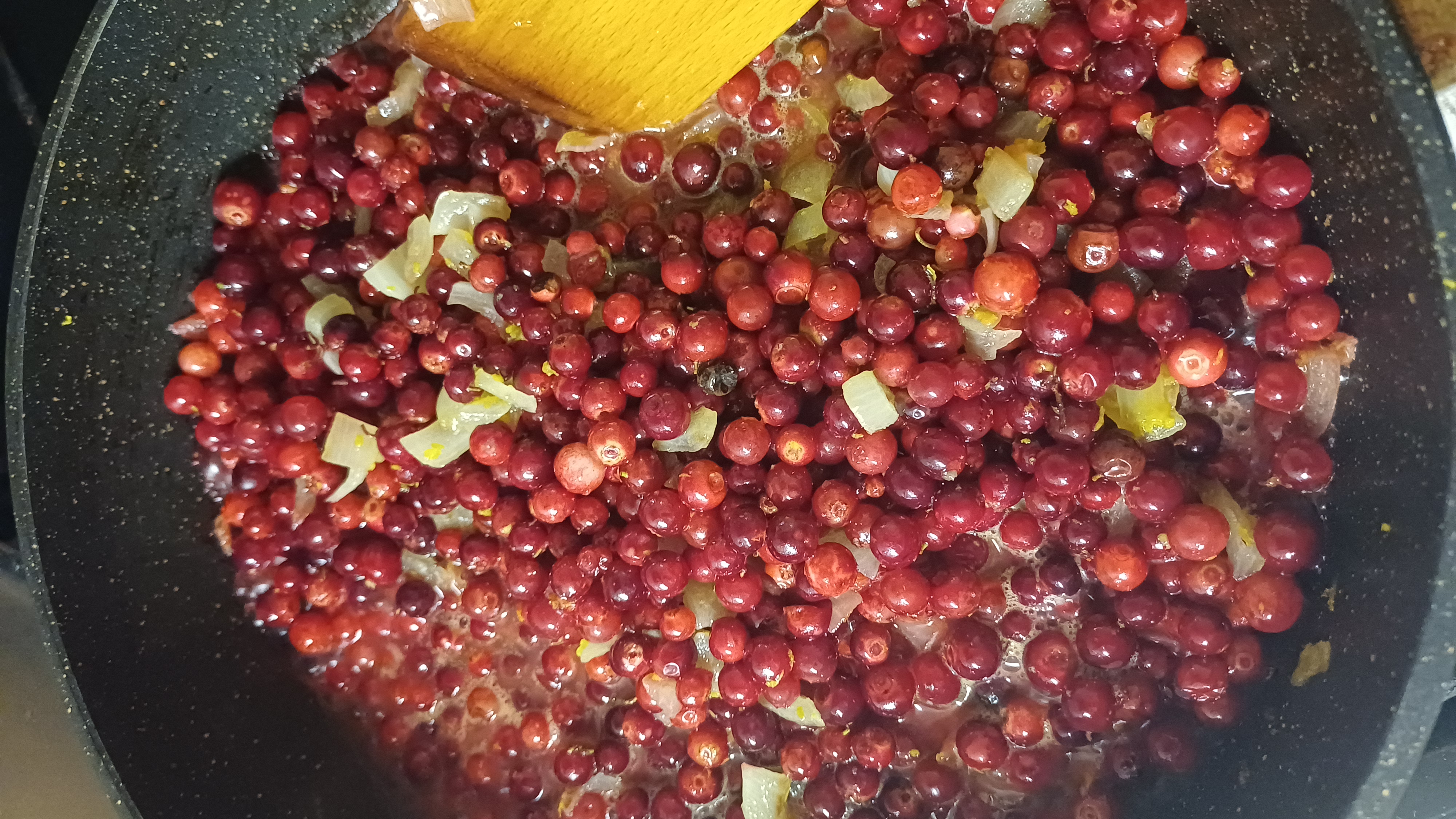 - Эту ароматную сладость выливаю к луку с брусникой. Перемешиваю. Тушу ещё минут 10. Теперь у нас не просто овощи и ягоды — у нас начинается история.