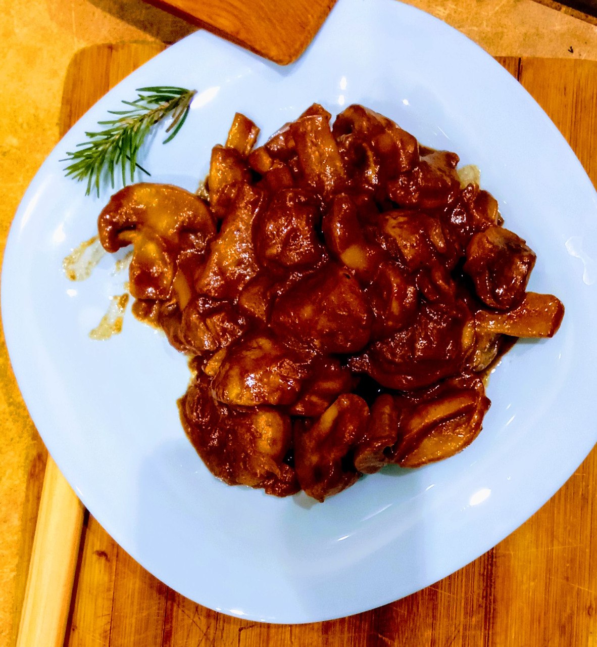 - Вытащить грибы из соуса и положить в раскаленное масло. Обжариваем и выпариваем лишнюю жидкость пока соус, который был на грибах не начнет густеть и карамелезироваться на стенках сковороды или казана.