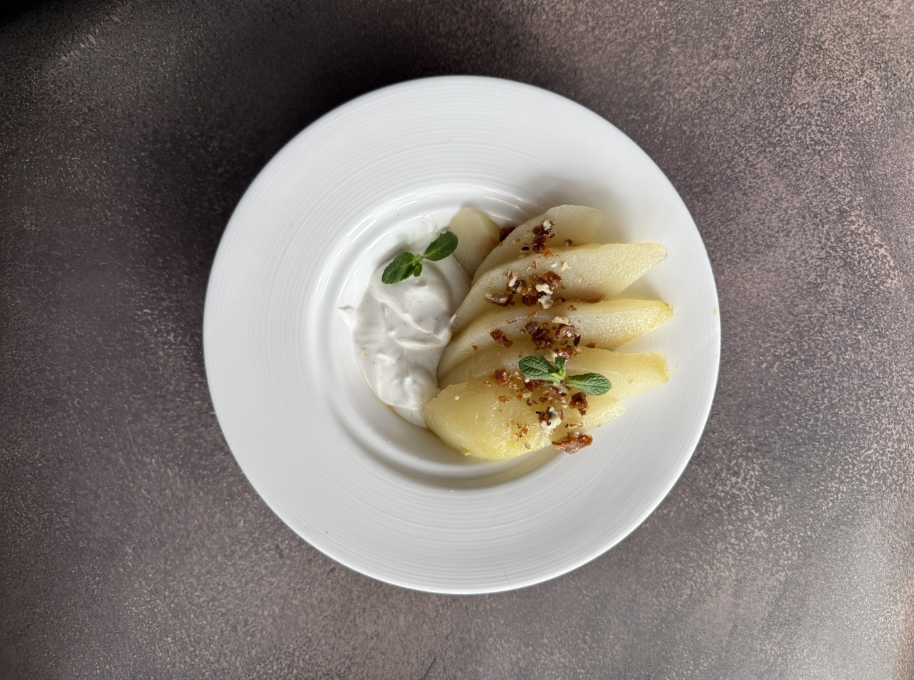 Чтобы сделать йогуртовый соус, достаточно положить в греческий йогурт ваниль, немного сахарной пудры (чтобы не было сильной разницы между очень сладкой грушей и очень кислым йогуртом), лимонную цедру и перемешать.