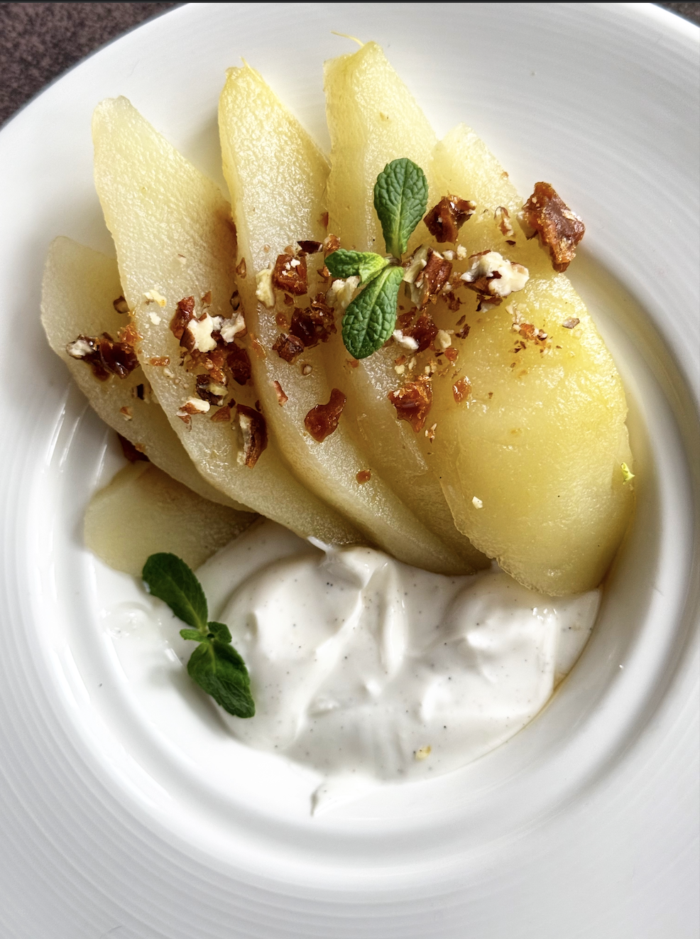 Это блюдо очень удивительно в своей простоте. Готовится из простых, доступных продуктов, а результат получается как в ресторане! Я периодически варю груши в чём-нибудь: в вине или обычной воде, потому что это быстрый способ увкуснить фрукты, сделать их интереснее.
