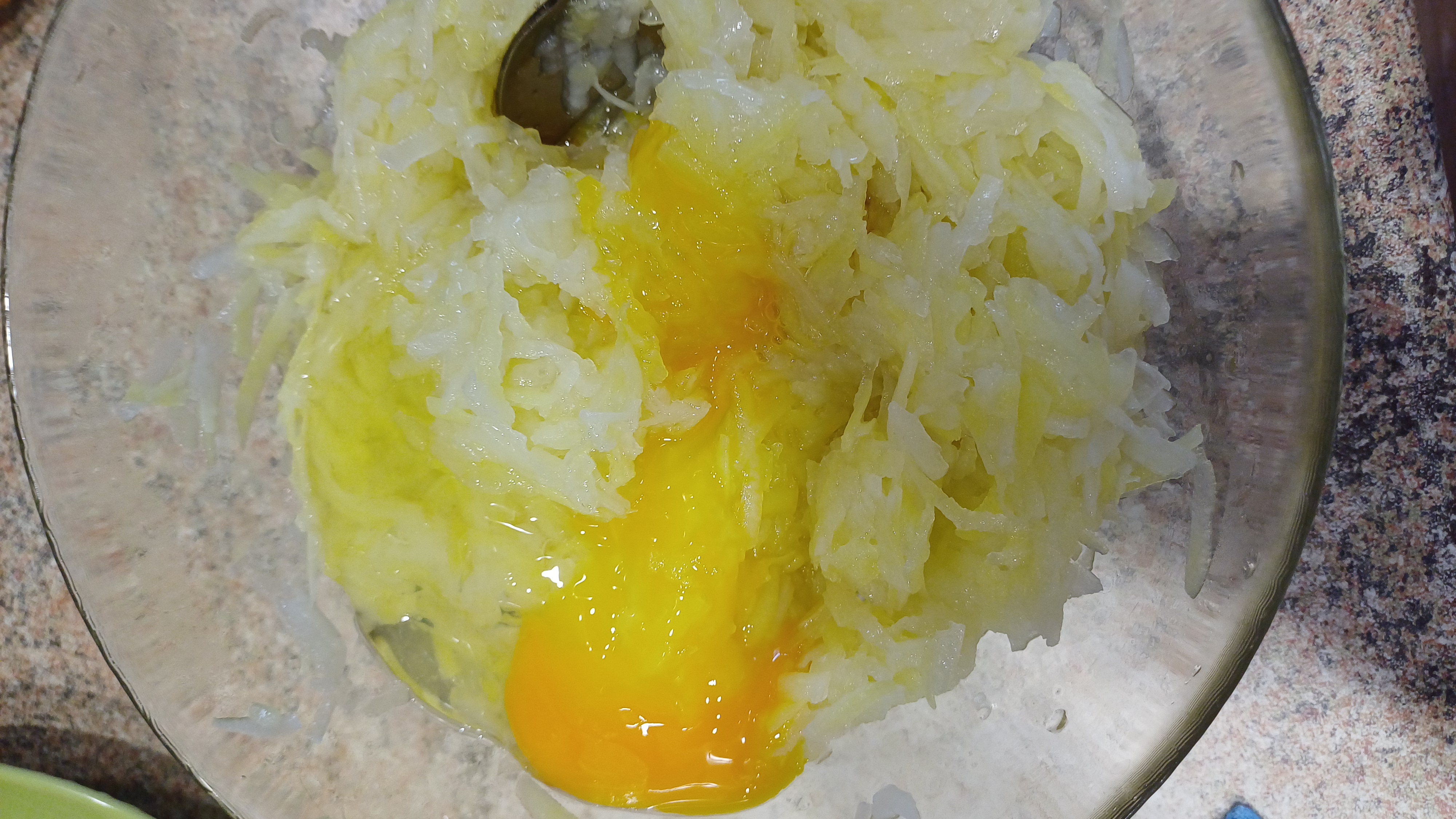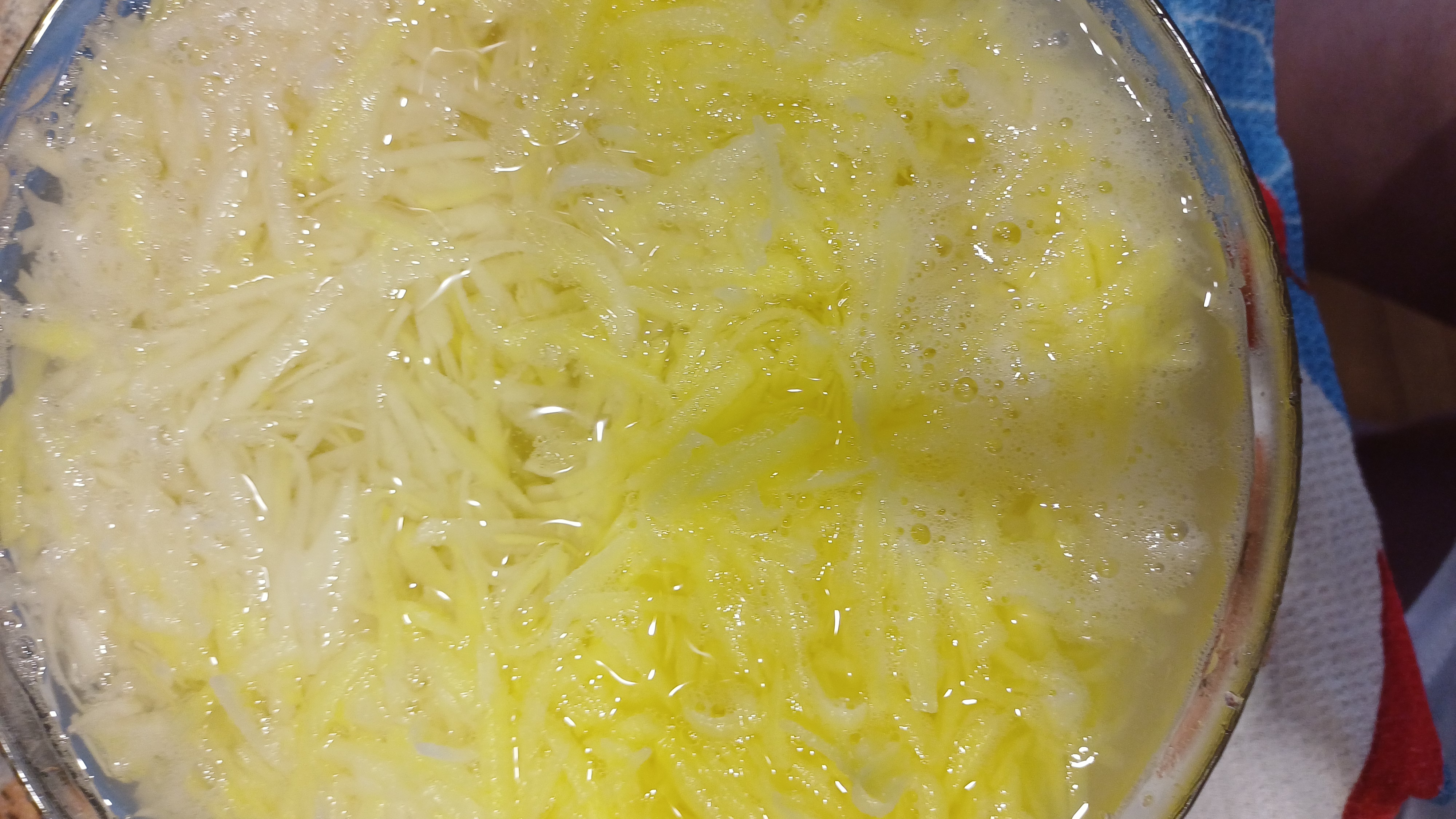 2. В кипящую воду — аккуратно, чтобы не ошпариться — опустила тёртый картофель. Варю минут 7. Не до готовности, а до состояния «я почти сдаюсь, но ещё держусь». Главное — не переварить. Иначе получится не блинчик, а пюре с сожалением.