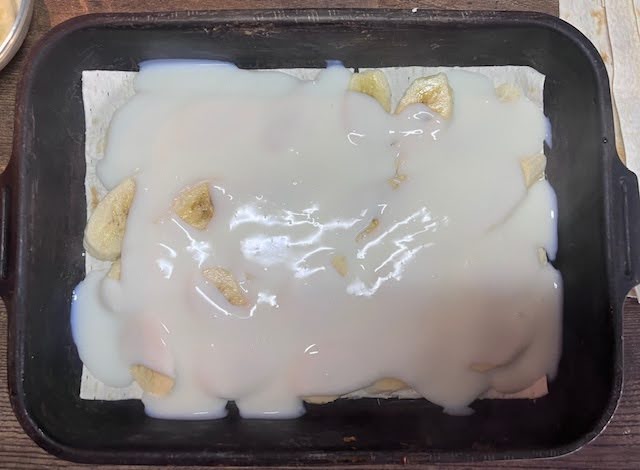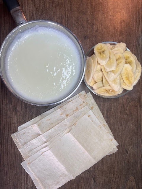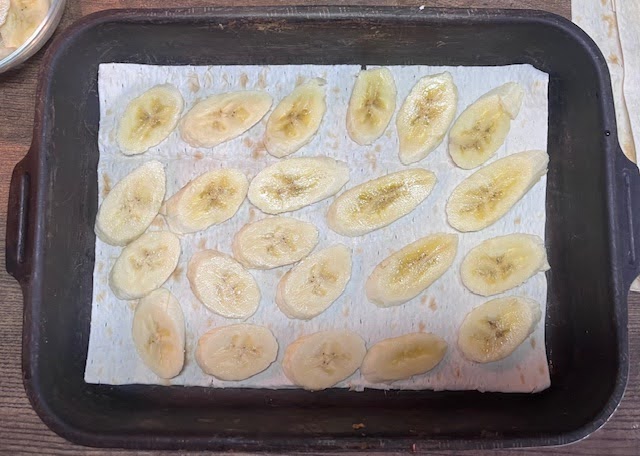 4 шаг: собираем десерт в имеющуюся емкость (контейнер) выкладываем лаваш / банан / крем и чередуем пока не кончатся ингредиенты, далее даем остыть и ставим в холодильник для стабилизации на не менее 4 часов, в идеале на ночь.