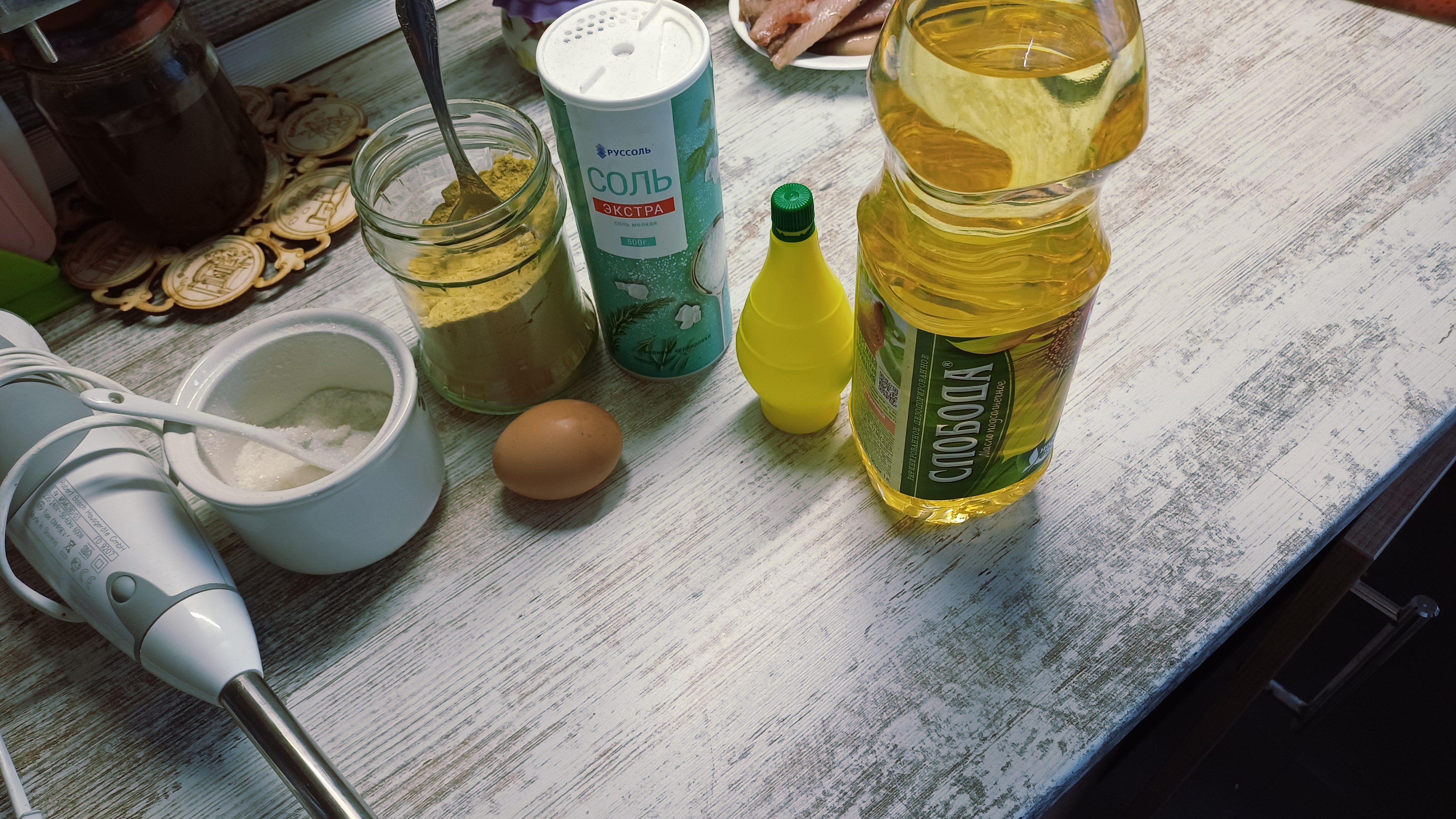 1. Вбиваю яйцо в высокий стакан — тот самый, что обычно стоит рядом с блендером и ждёт своего часа. Добавляю сахар, соль, горчицу. Заливаю почти всё масло — но не всё. Оставлю немного про запас, на случай, если судьба решит проверить мою стойкость.