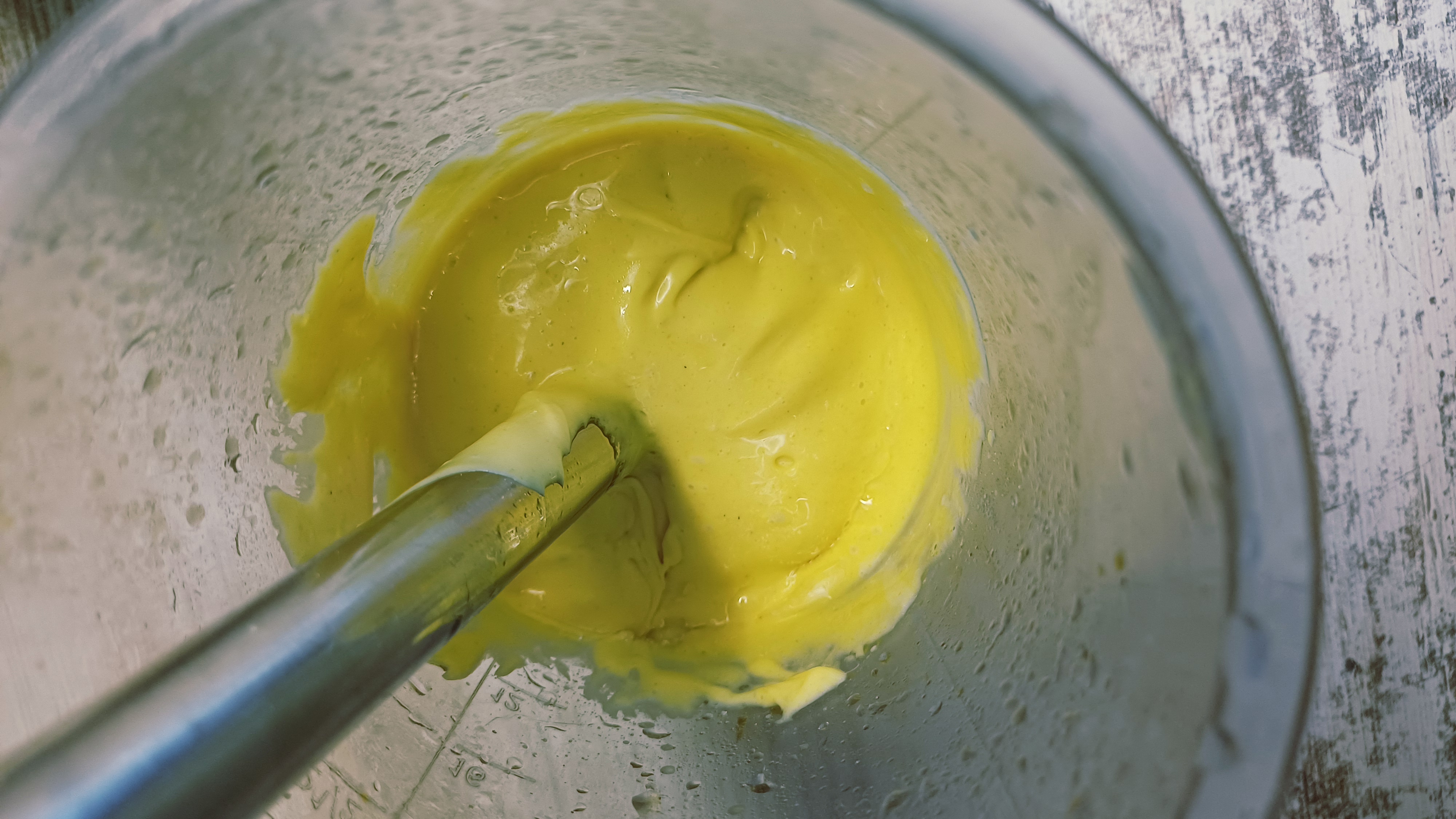 2. Опускаю погружной блендер до самого дна, чтобы яйцо и все ингредиенты оказались строго под лезвиями. Это важно. Как в жизни: чтобы что-то начало работать — нужно собраться в одной точке.