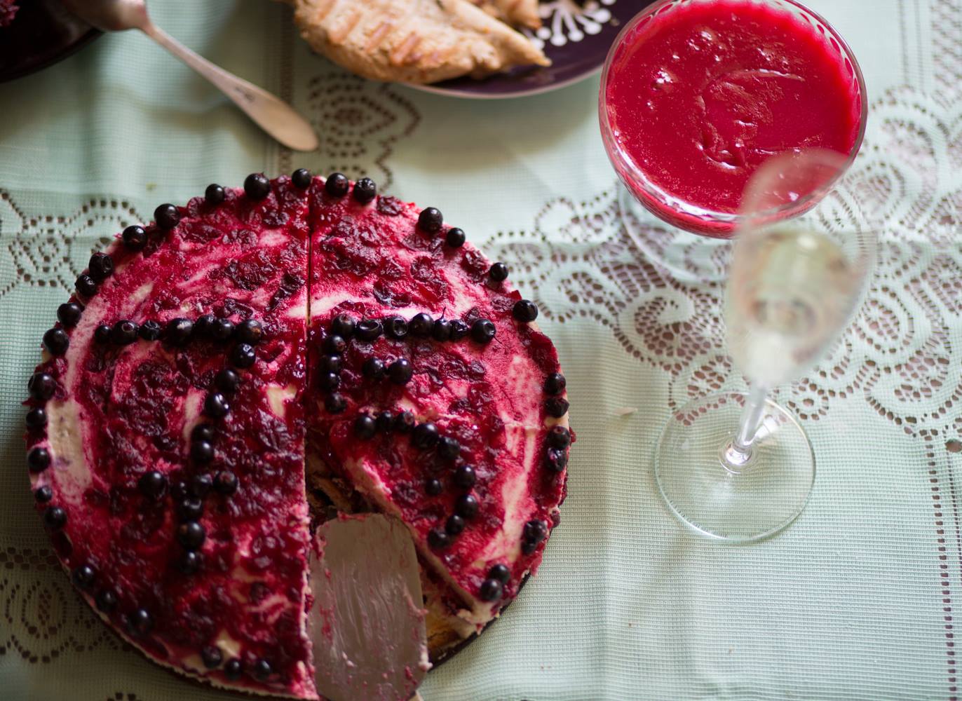 - Сборка торта: корж, сверху крем из масла со сгущенкой, клюквенный соус, корж, крем, соус.