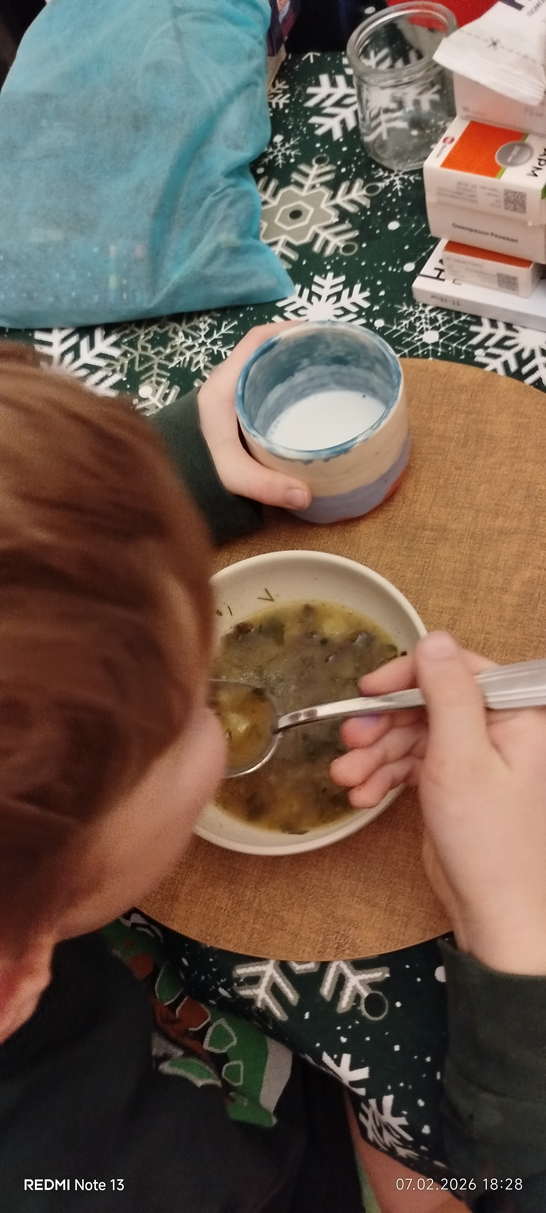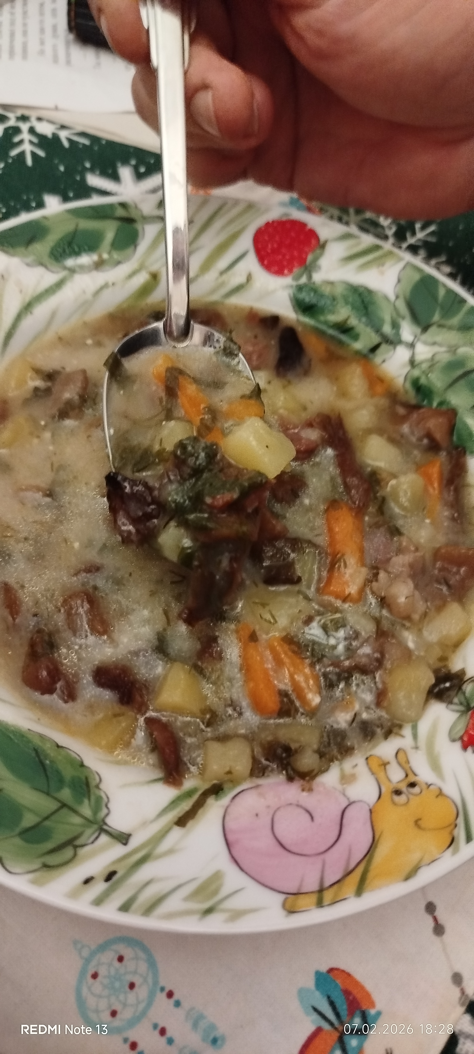 Нашла в морозилке кусочек говядины, немного грибов, собранных года два тому в лесу))), нашла и одна морковка и луковица. Мясо куском варю, картошку режу кубиком и к мясу. На скороворке слегка припускаю на масле морковку соломкой,лук кубиком и сверху мороженую глыбу грибов и тушу. Соль. Приправа Какая нравится. Досылаю в кастрюлю с картошкой. Мясо извлекаю,режу на мелкие фрагменты и обратно. Тушу ещё. В морозилке нашла 3 года назад запасов резанные укроп и петрушку — вот щедро в кастрюлю. Соль,горошком перец и тушим.