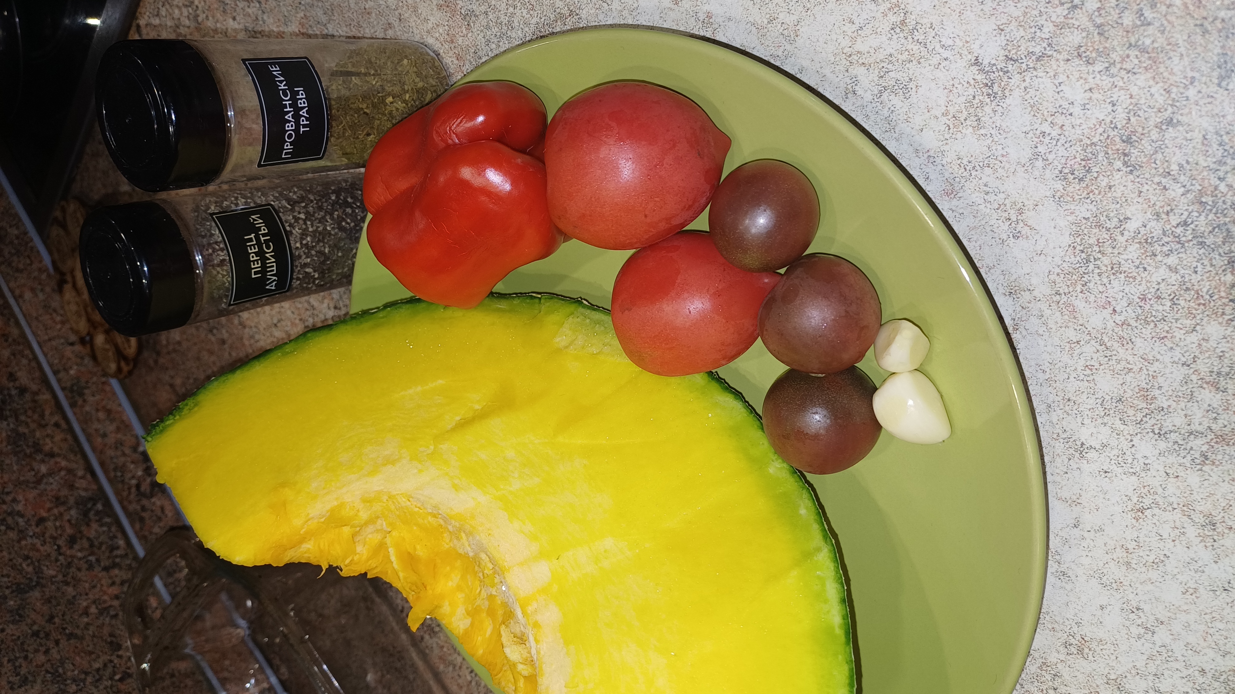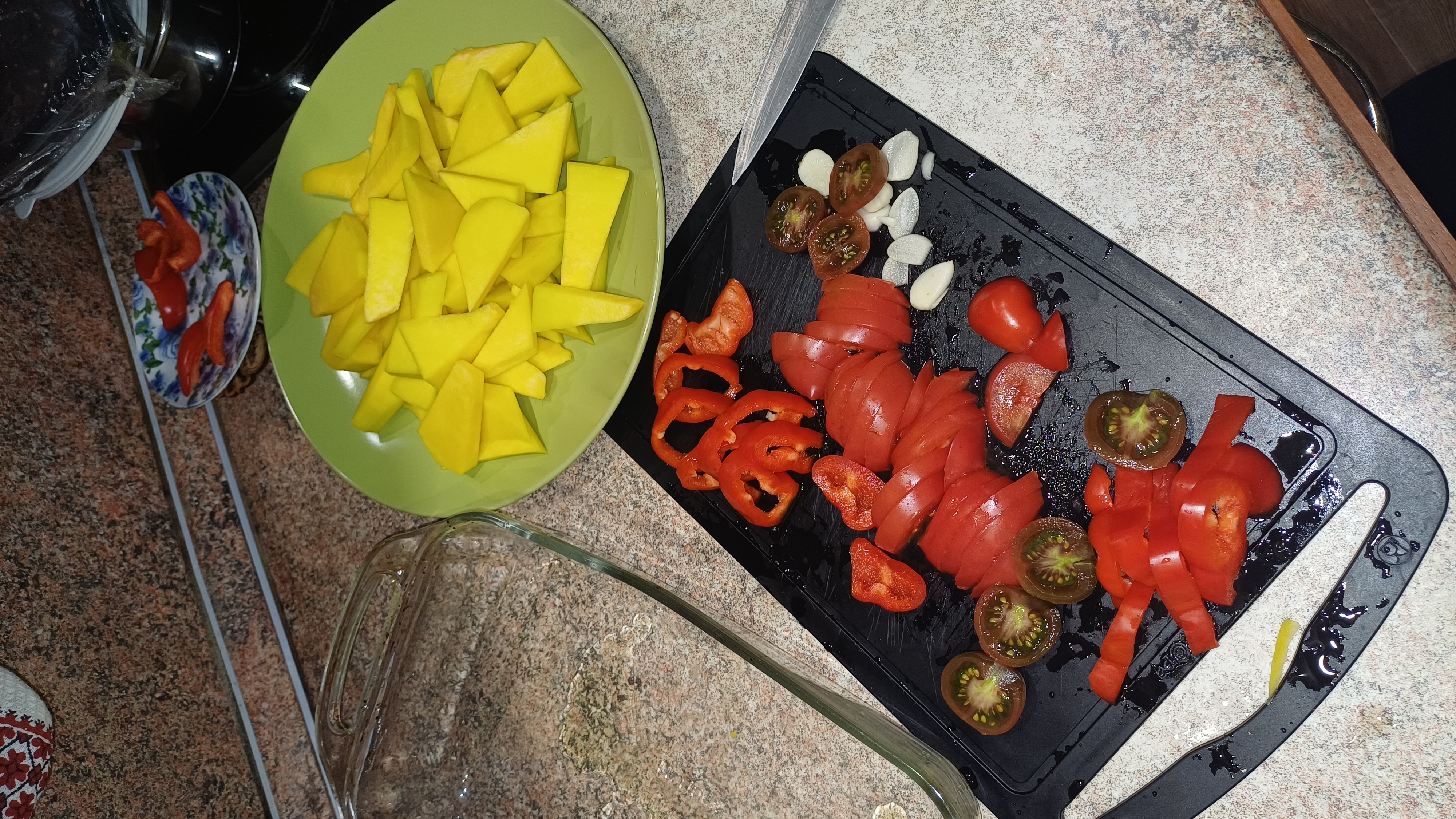 1. Овощи режем, как вам нравится — главное, чтобы тыква была небольшими кусочками. Чтобы пропеклась, а не просто загорела. Чеснок — пластинками. Помидоры — пополам или четвертинками. Перец — полосочками, как будто он готовится к параду.