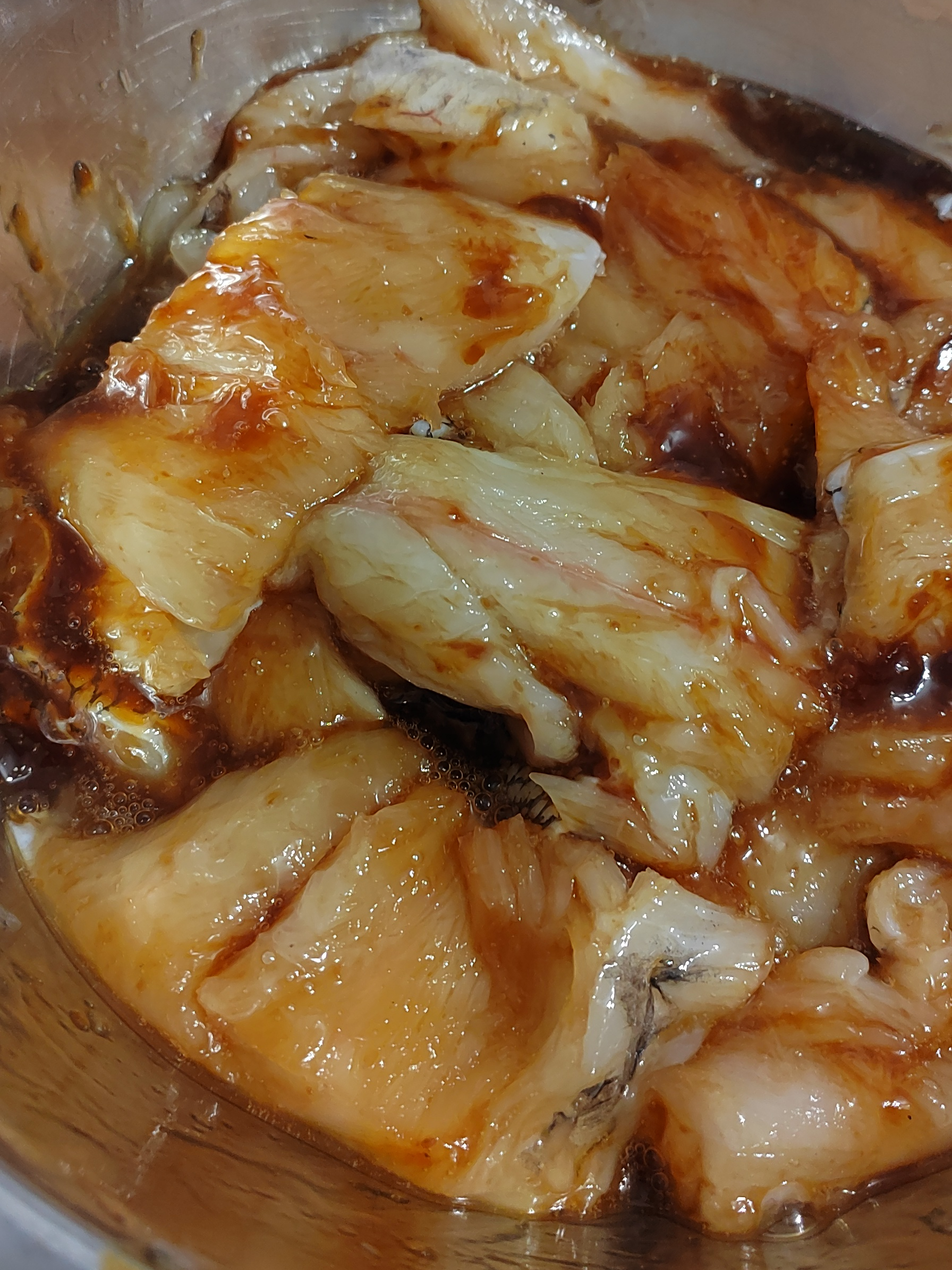 - В глубокой миске смешайте рыбу с соусом терияки. Убедитесь, что каждый кусочек хорошо покрыт маринадом.