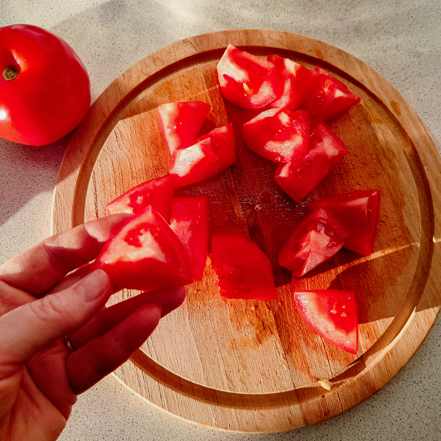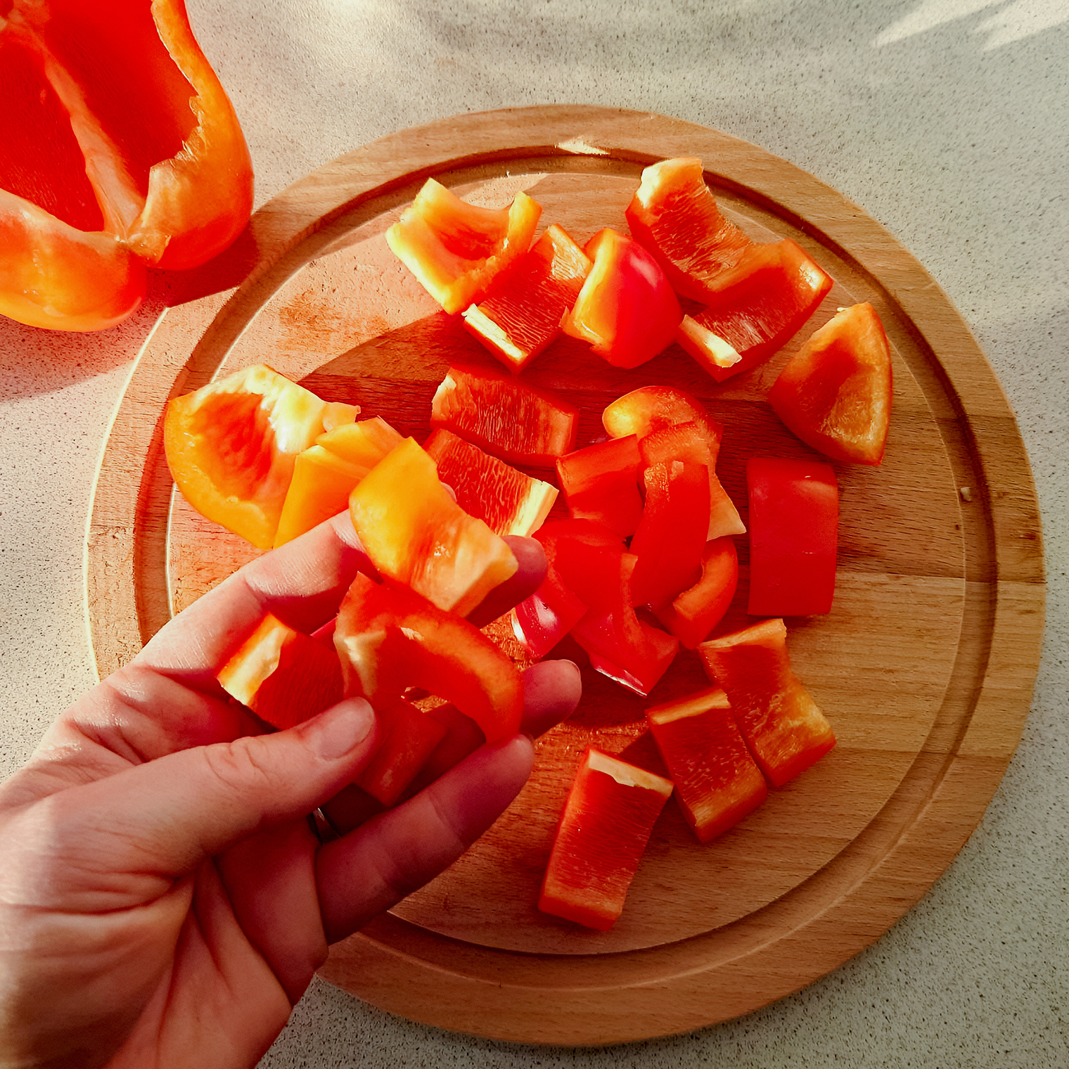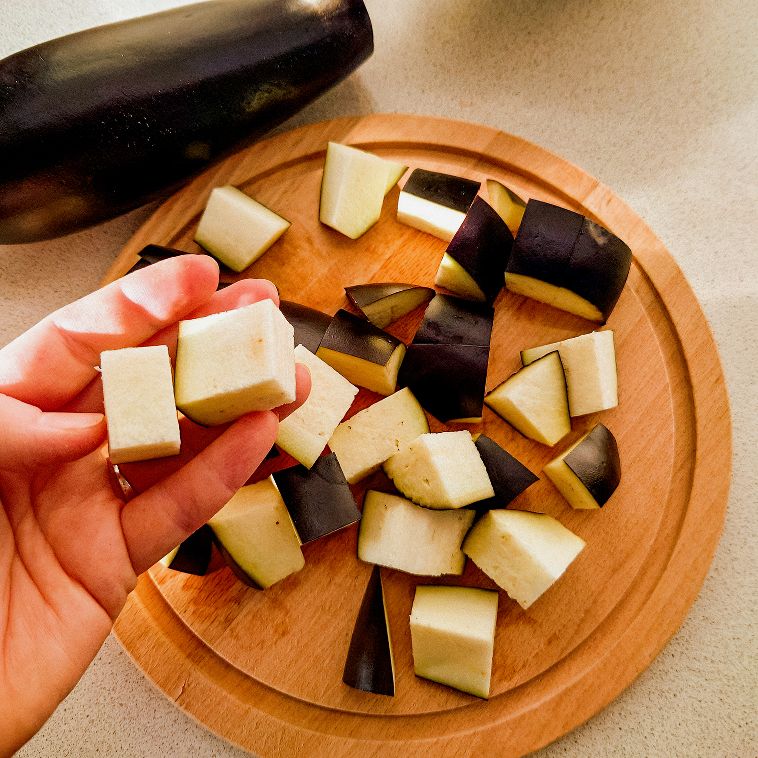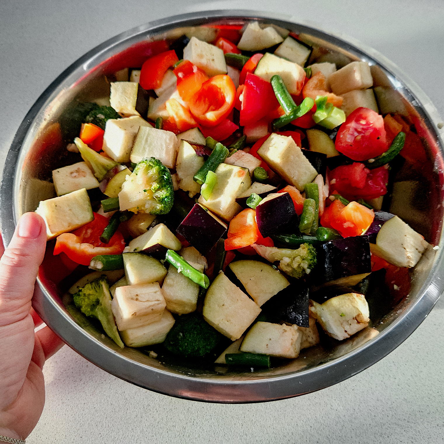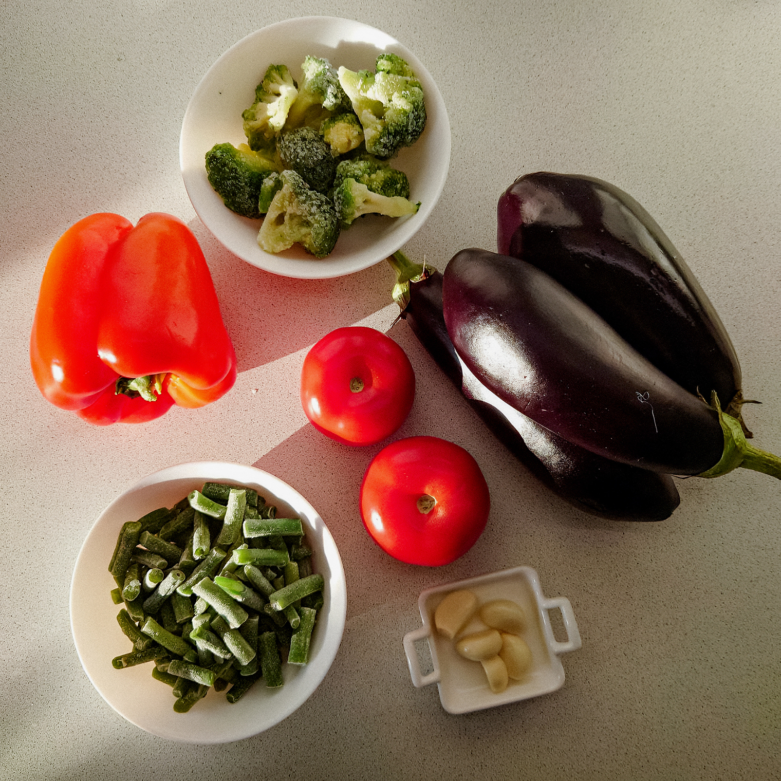 Шаг 2. У баклажанов и сладкого перца удалить плодоножки, нарезать крупными кубиками стороной 2,5 × 2,5 см, помидоры — кусочками. Сложить в большую миску и добавить стручковую фасоль и брокколи. Если используете замороженные, заранее размораживать их не нужно.
