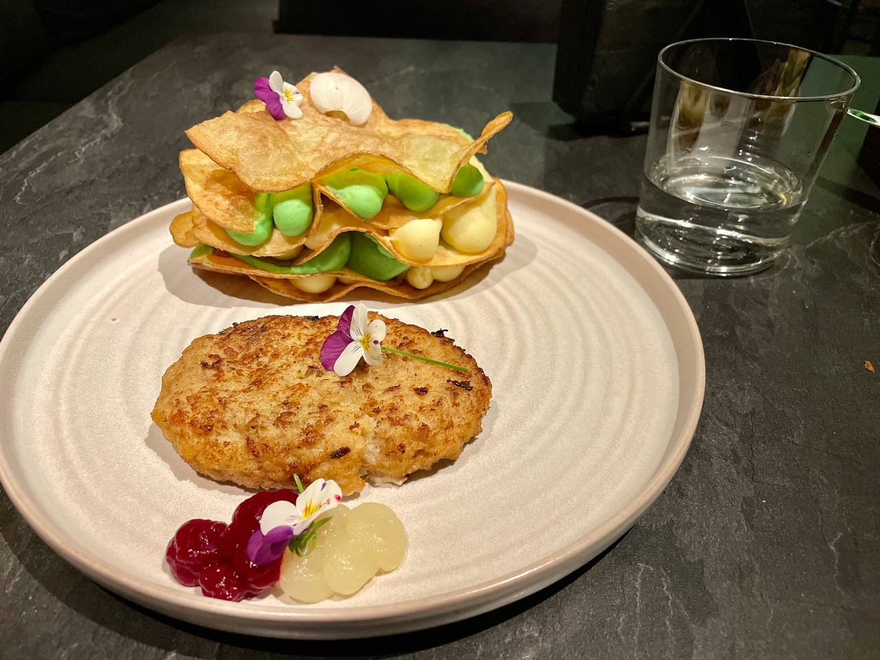 - Мильфей из картофеля, увенчанный нежной треской.