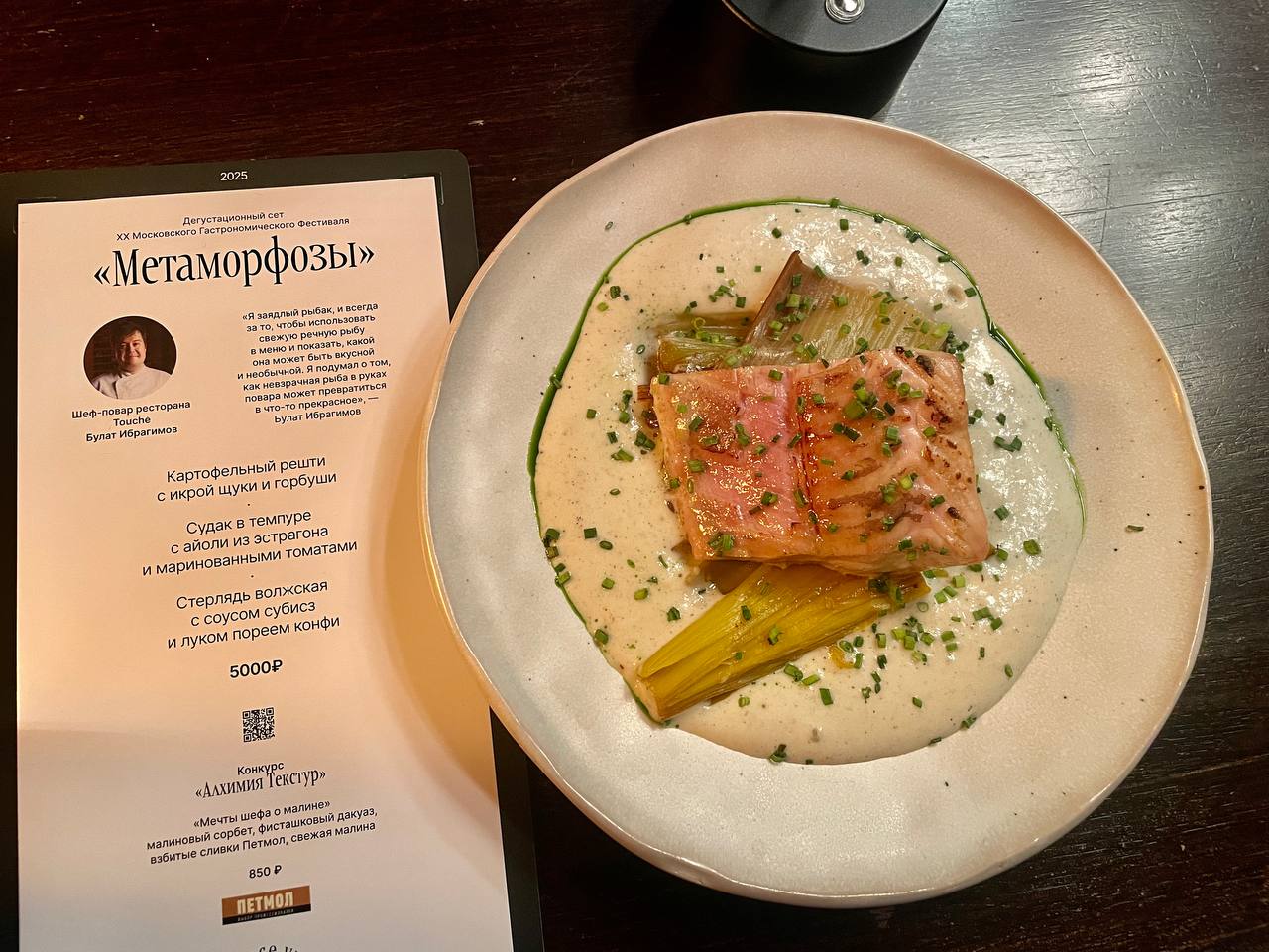 В палитру «Пути художника» вошли: хрустящие картофельные рёшти, увенчанные самоцветной россыпью икры щуки и горбуши с шапочкой сметаны, нежнейший судак в невесомой темпуре, аккомпанируемый пикантным айоли из эстрагона и солнечными маринованными томатами, что придавало дополнительную сочность блюду. И, наконец, волжская стерлядь, облаченная в бархатистый соус субисс и дополненная деликатным конфи из лука-порея. Это был самый вкусный лук-порей в моей жизни… случилась любовь.
