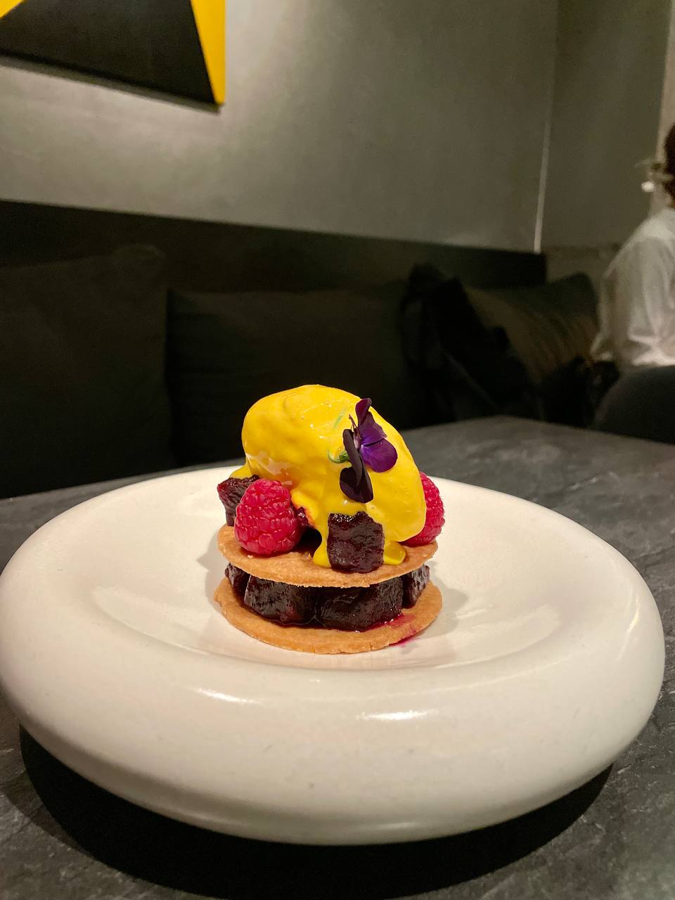 Честно, я не планировала десерт, а когда увидела название «Мечты шефа о малине», не смогла устоять. Прохладный малиновый сорбет, гармонирующий с хрустящим фисташковым дакуазом (обожааааю) и рубиновыми ягодами свежей малины покорил меня. Как же была вкусно и красиво моим глазам и рецепторам.