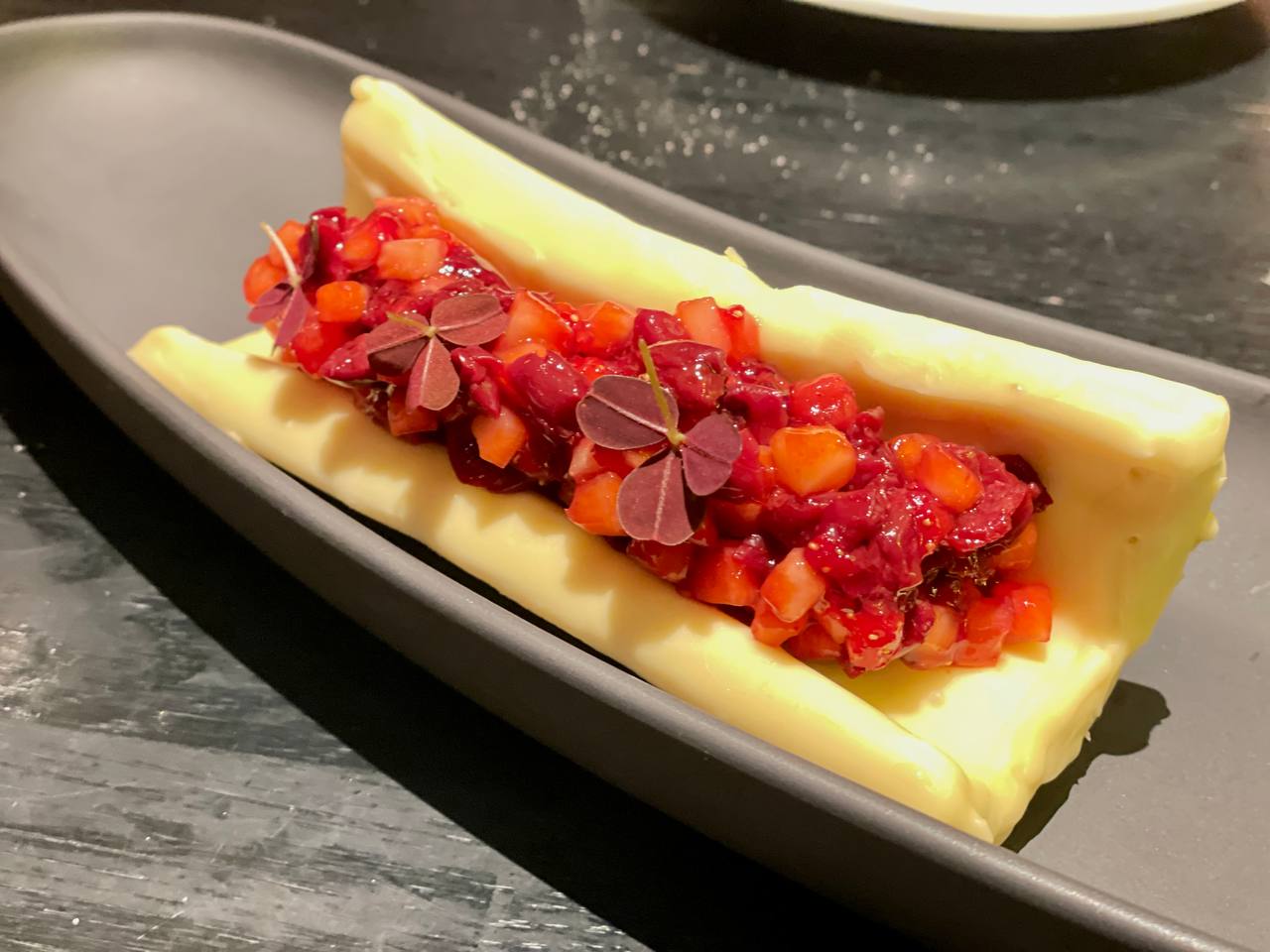 Внутри — нежнейший мусс из ванили и пьянящих бобов тонка, хрустящий белый шоколад и взрывающийся свежестью ягодный тартар. Я развала этот десерт парфюмерным, потому кислинки яблока и вишни вместе с томленой клубникой звучали волшебно!