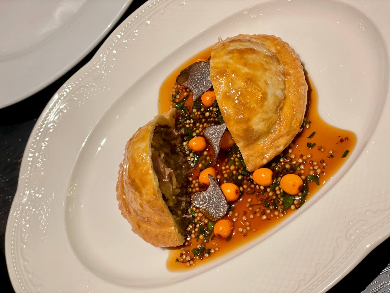 Третье блюдо, которое я очень ждала — пирог с томлёным говяжьим хвостом, опьяняющим ароматом свежего трюфеля и искрящейся облепихой. Какую красивую гамму создает облепиха. Это нужно пробовать!