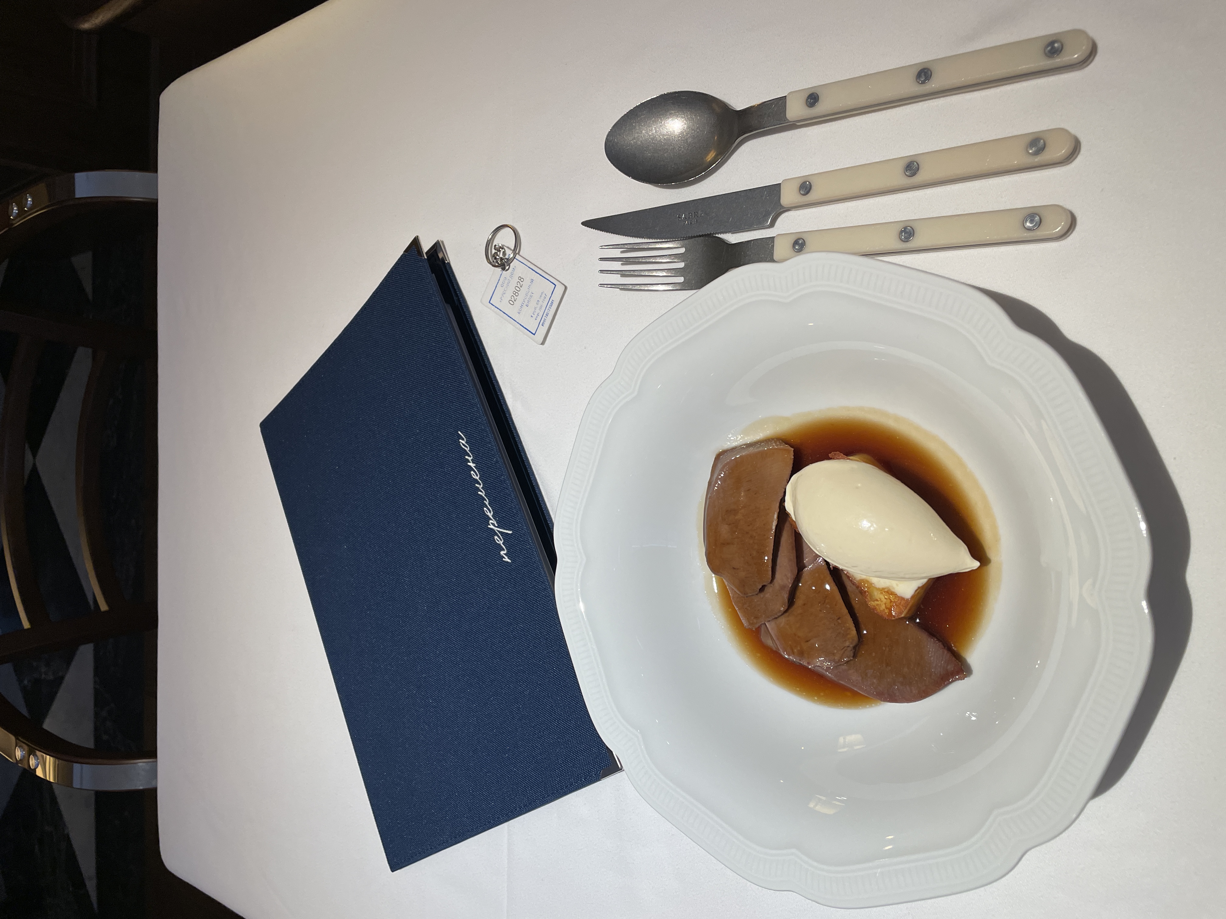 Снова русская кухня в меню, но не типичная подача. Я заказала говяжий язык, который подали на картофельной запеканке (космической, я бы такую запеканку ела на завтрак регулярно) с шапкой мороженого из хрена. Ребята, знали бы вы, что происходило с моими рецептора. Это невероятно вкусно. Мороженое из хрена покорило меня, честное слово) Ещё был блин с крабом… То есть на прямоугольнике блинчика сверху лежала добротная порция крабового мяса с салатом из яйца, а внутри был картофель. Очень сытно, опять же — необычно) блины с крабом я ела впервые.