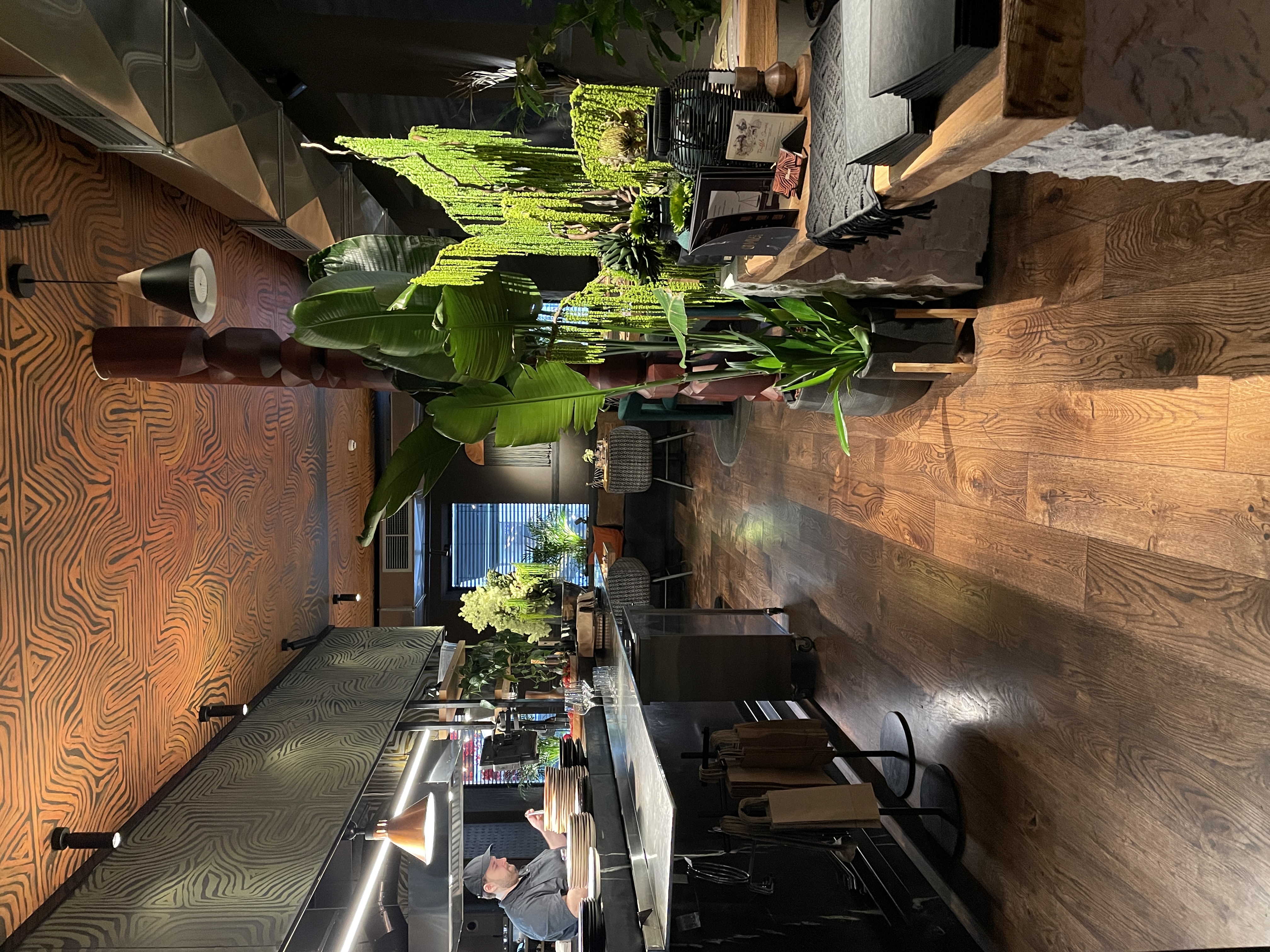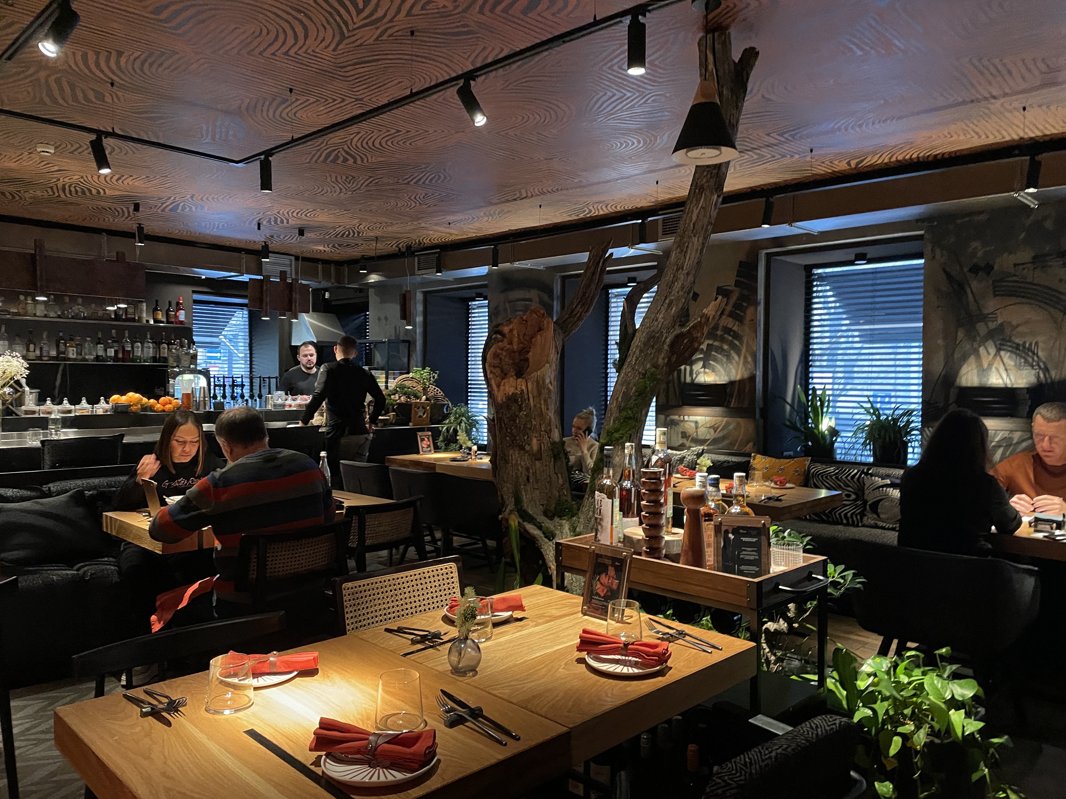 Двухэтажное зелёное пространство. Заехала на обед по рекомендации перед поездом. На первом этаже ресторан с совершенно фантастическими зелеными композициями. На втором этаже — бар и кальянная зона. Там оказалось гораздо больше гостей, чем внизу, поэтому я выбрала первый этаж.